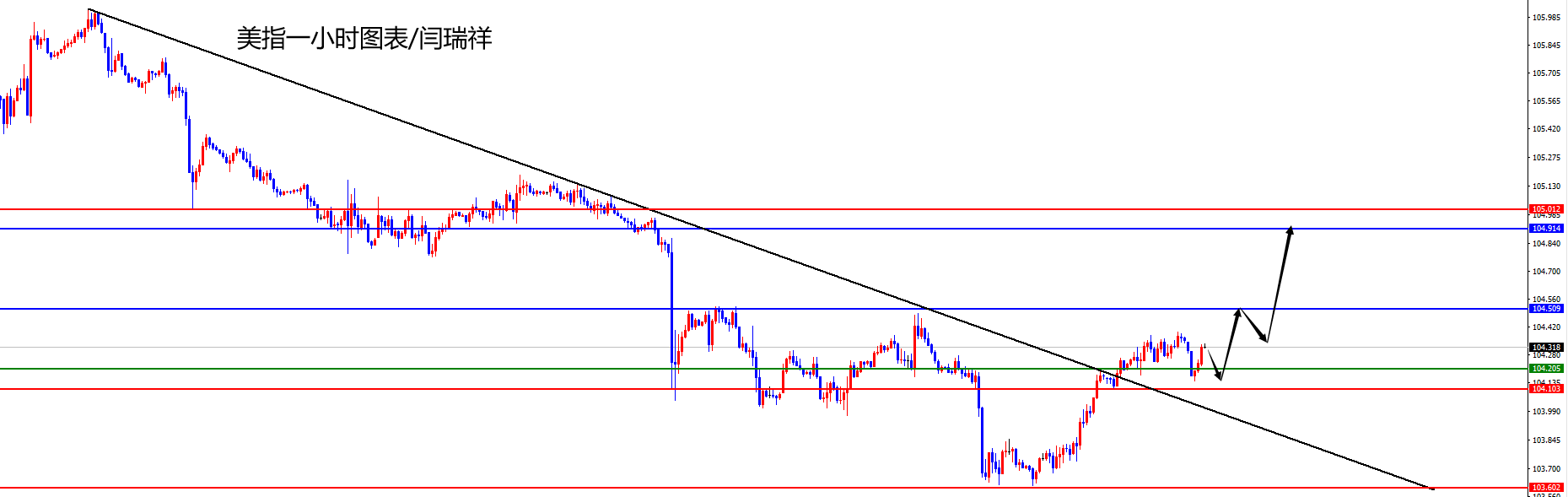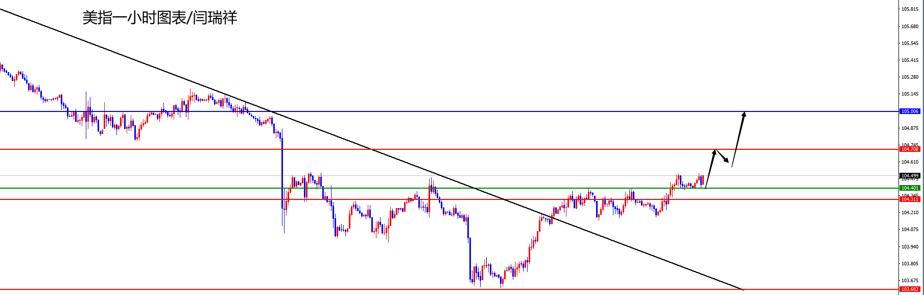 【美元指数】 美元指数方面,上周五美元指数价格总体呈现上涨的状态。当日价格最高上涨至104.395位置,最低于104.104位置,收盘于104.351位置。回顾上周五美指价格表现,早间开盘后价格短线震荡后再度上行,随后一直维持震荡上涨表现,当天最终收盘也是在高位附近。从周线收盘看价格属于探底回升,目前周线暂时