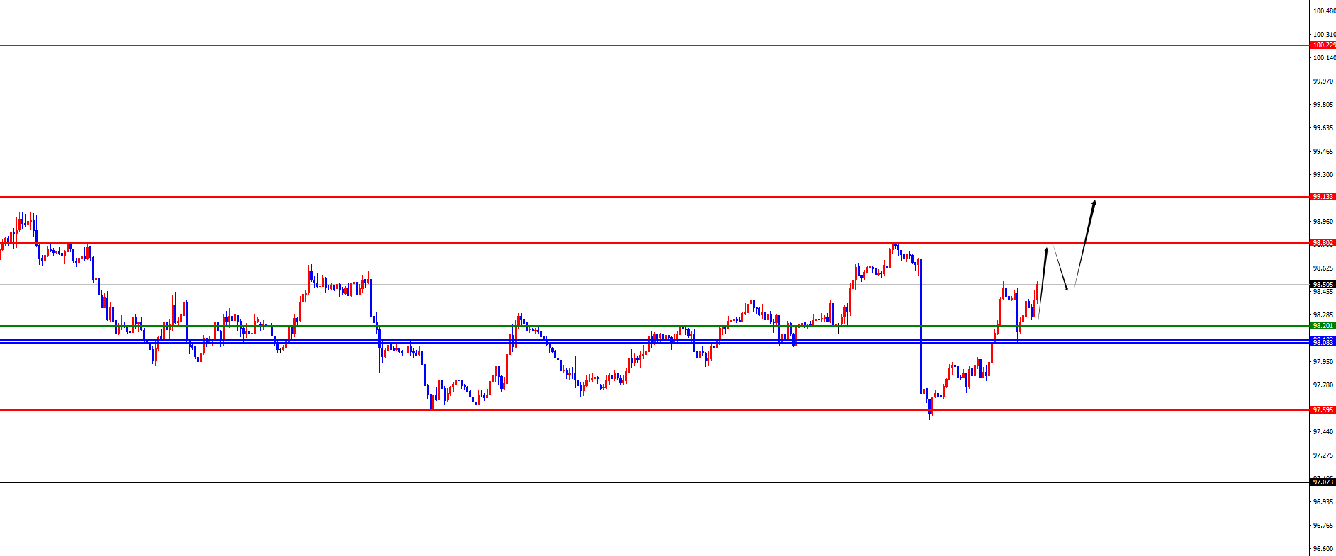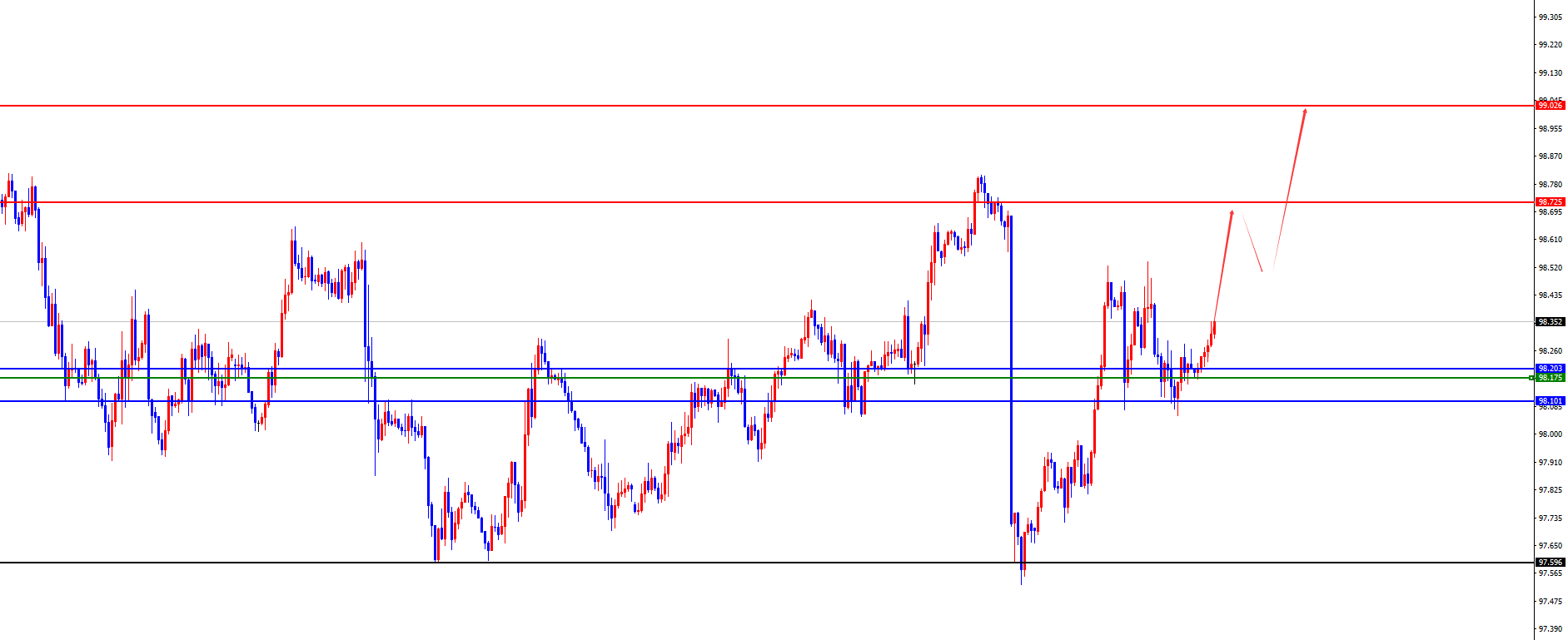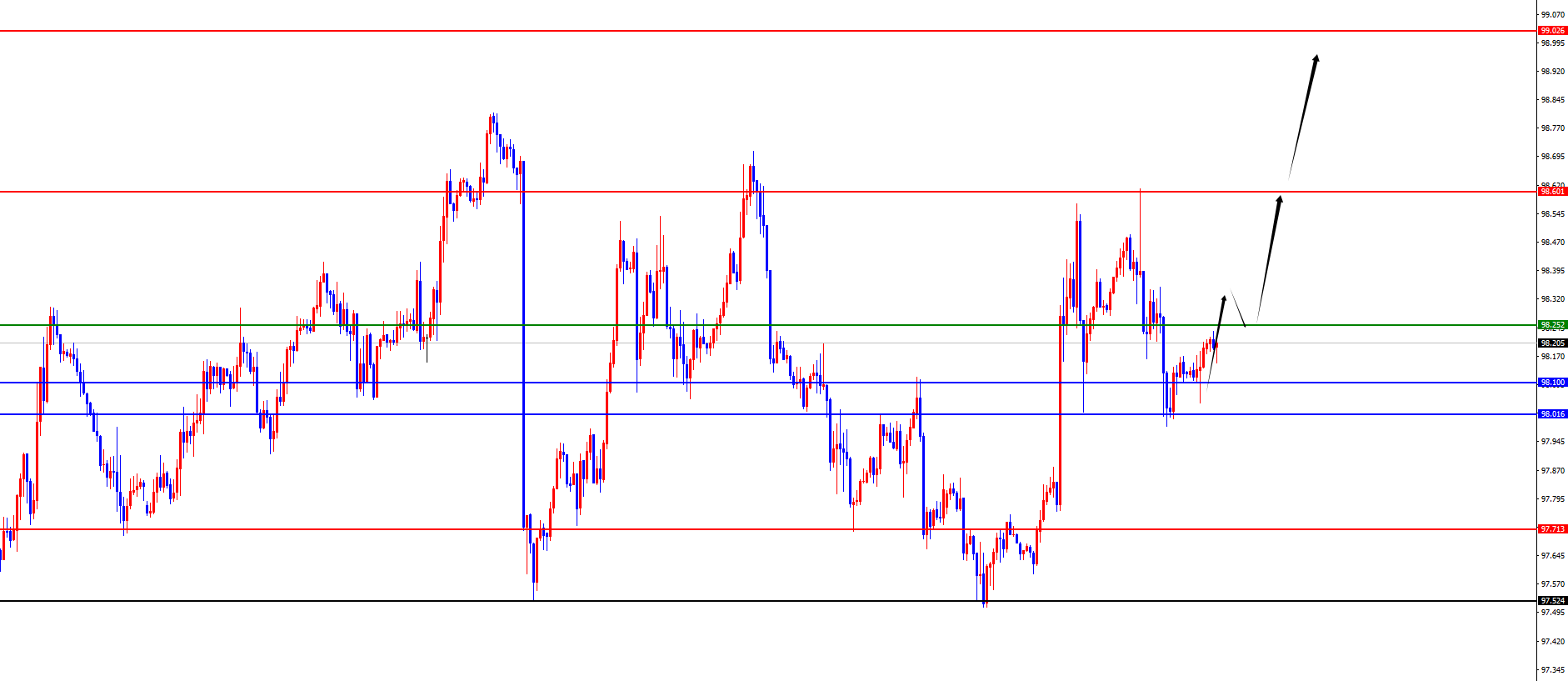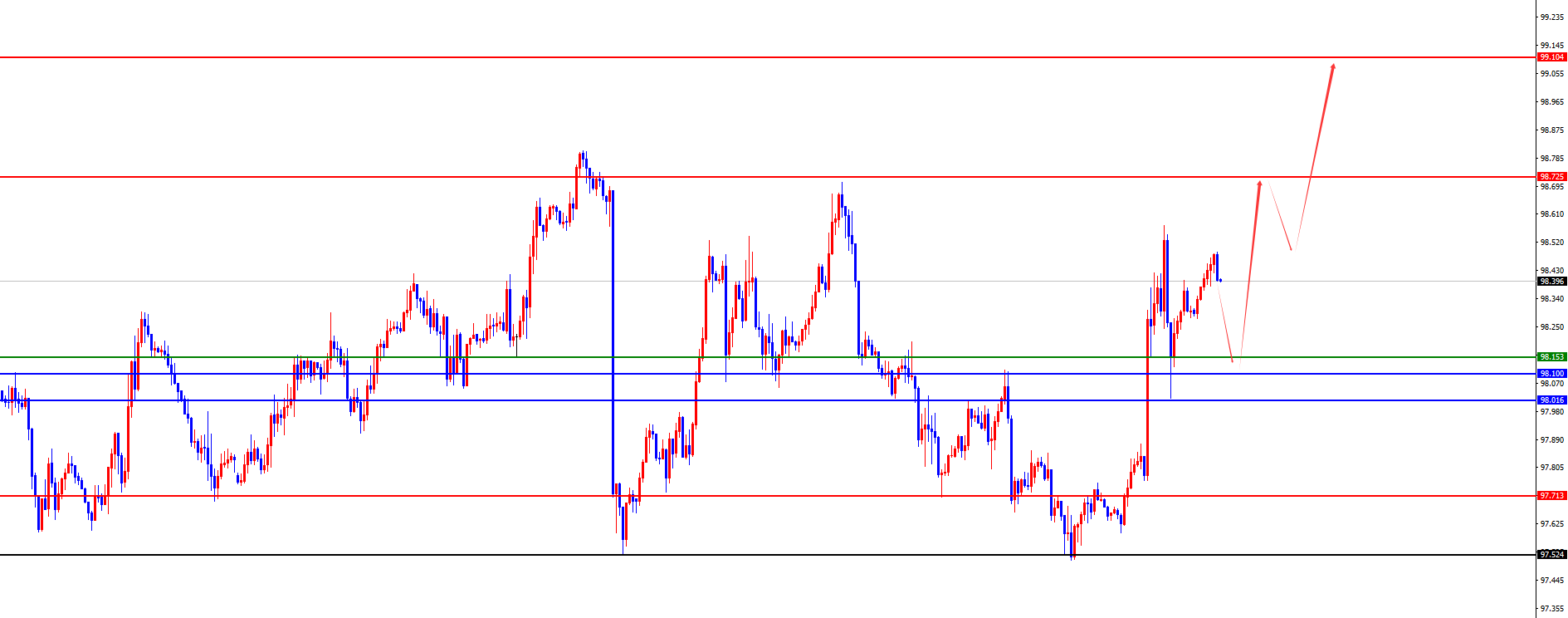 美元指数 在美元指数的表现上,周二美元指数呈现出下跌的态势。当日美元指数价格最高攀升至98.539的位置,最低则下探至98.057位置,最终以98.202的价格收盘。回顾周二市场表现,在早盘期间价格短线先承压于前一日高点位置,之后价格如期向下回踩,从整体看价格正如笔者所言测试四小时支撑区域,后续不破此区域
