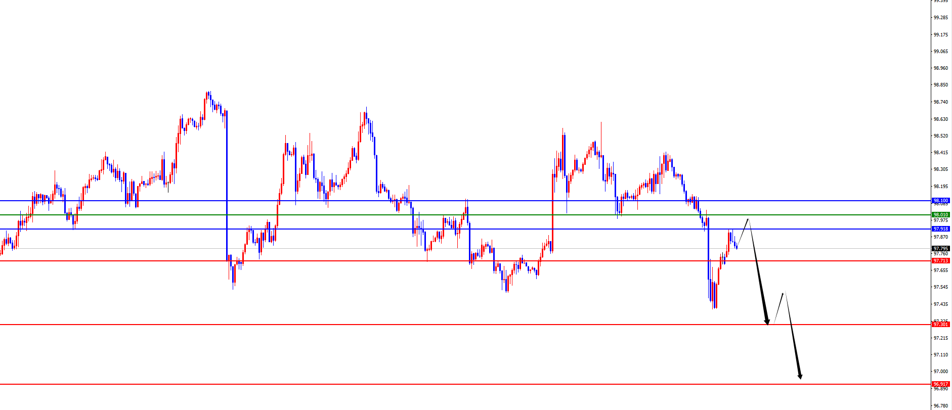 美元指数 在美元指数的表现上,上周五美元指数呈现出下跌的态势。当日美元指数价格最高攀升至98.276的位置,最低则下探至97.401位置,最终以97.697的价格收盘。回顾上周五市场表现,在早盘期间价格短线直接承压并下破四小时支撑位置,随后价格持续弱势并下破日线及周线支撑,晚间非农再度利空美指,价格一路承