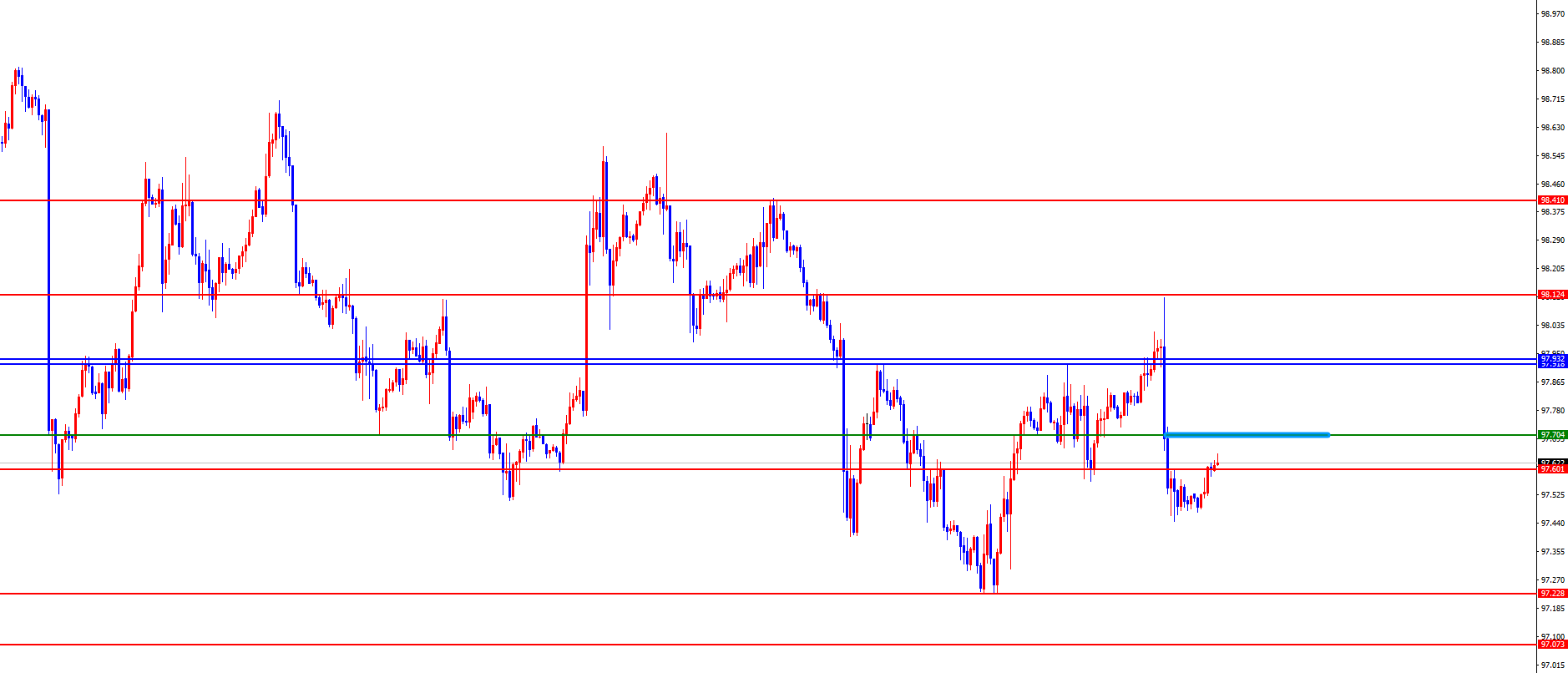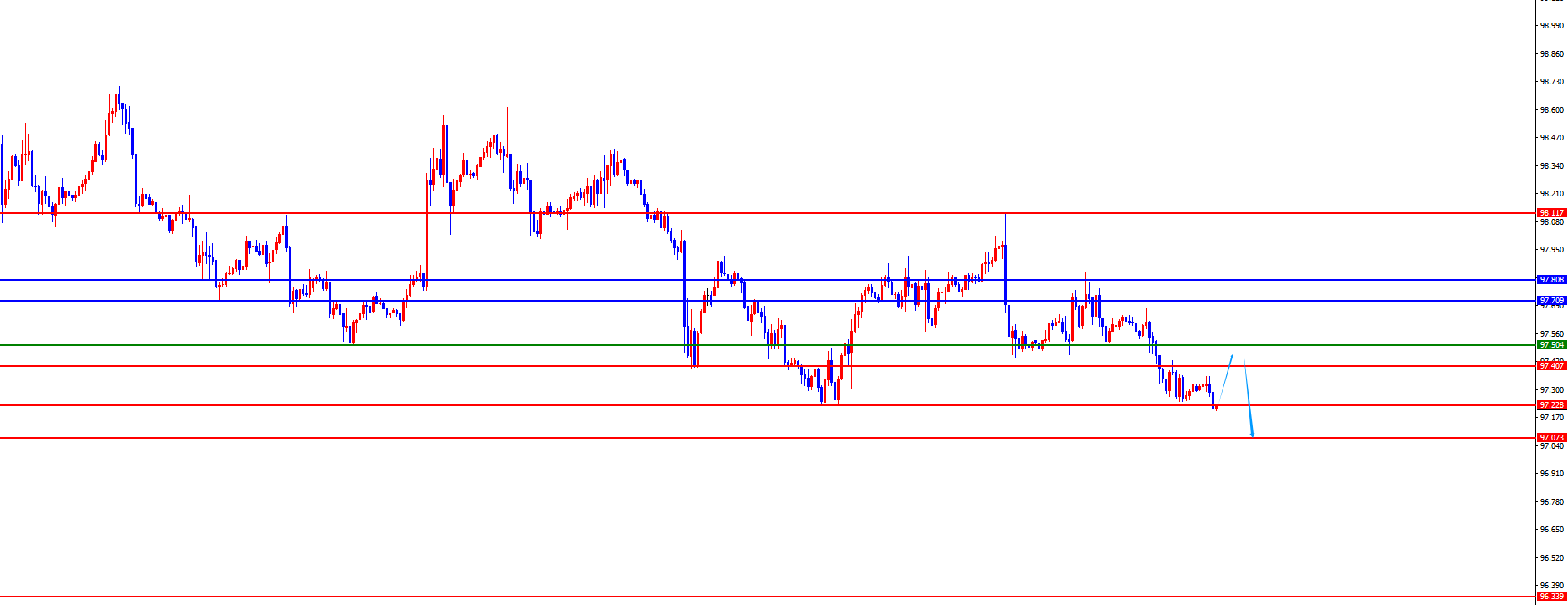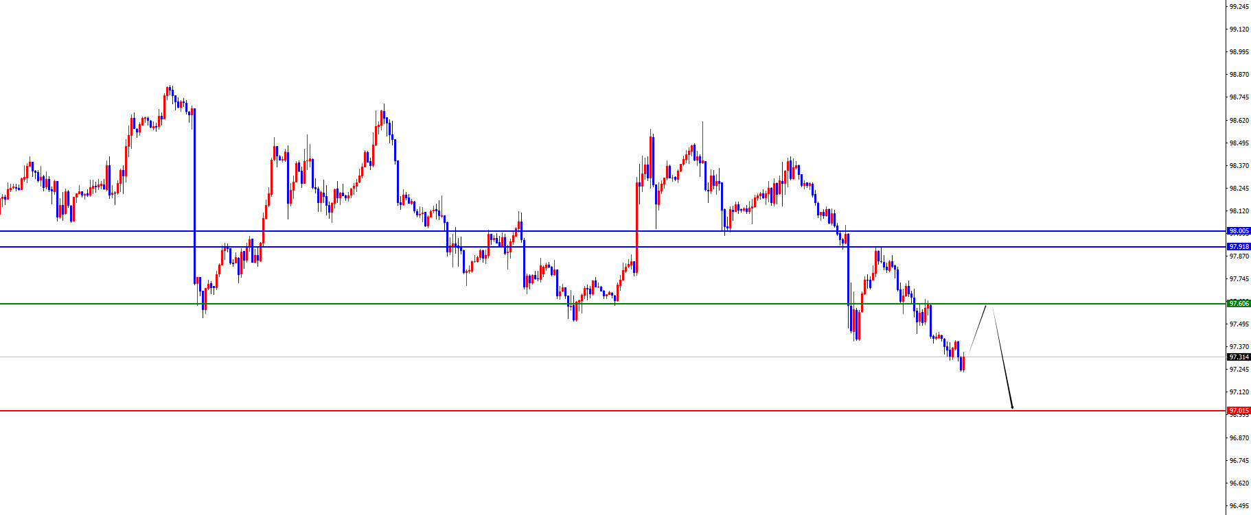 美元指数 在美元指数的表现上,周一美元指数呈现出下跌的态势。当日美元指数价格最高攀升至97.919的位置,最低则下探至97.391位置,最终以97.423的价格收盘。回顾周一市场表现,在早盘期间价格短线先向上修正测试到周线阻力位置,之后再度承压下跌,日内持续弱势到收盘,最终价格大阴状态收尾。 从多