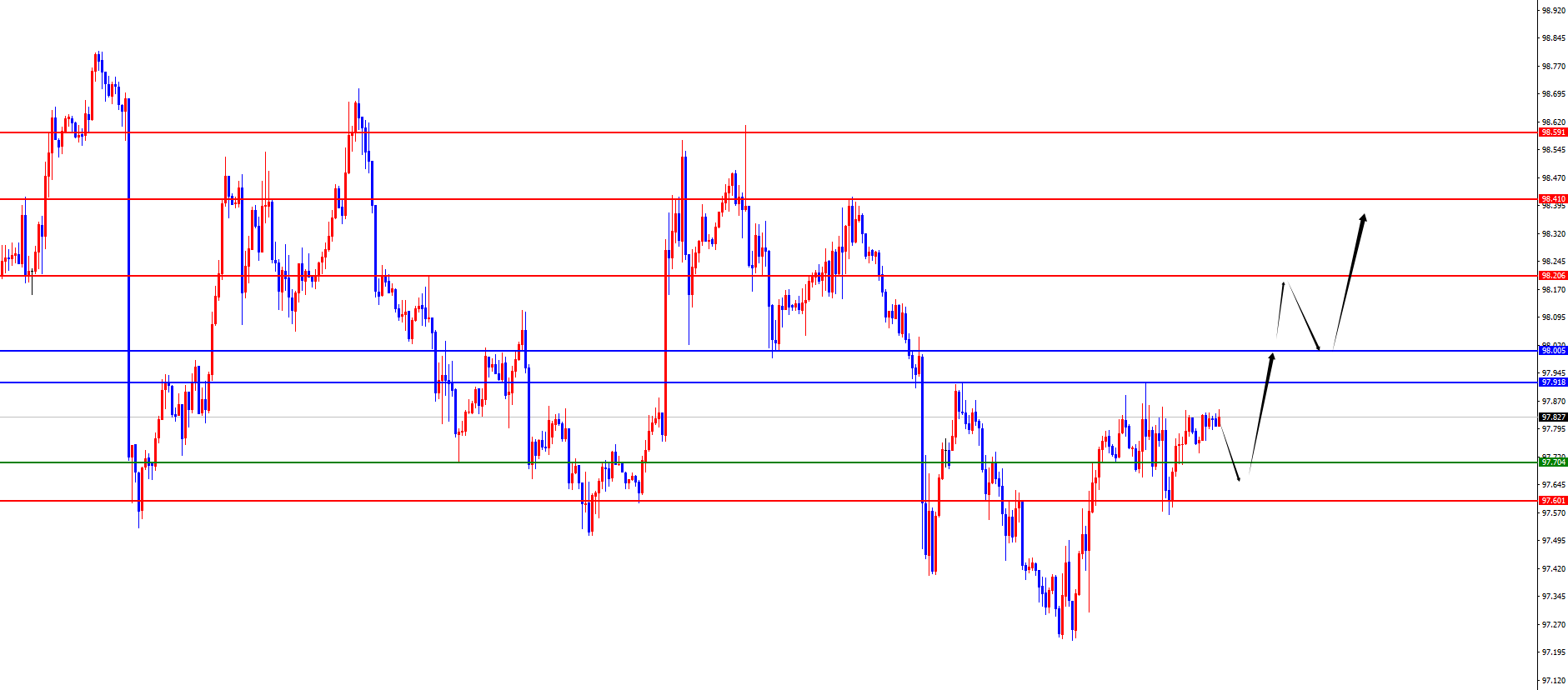美元指数 在美元指数的表现上,周三美元指数呈现出上涨的态势。当日美元指数价格最高攀升至97.92的位置,最低则下探至97.566位置,最终以97.825的价格收盘。回顾周三市场表现,在早盘期间价格短线先震荡运行,随后在美盘再度测试四小时支撑位置,最终在隔夜期间价格再度阳线收尾,整体上目前还是偏多对待。
