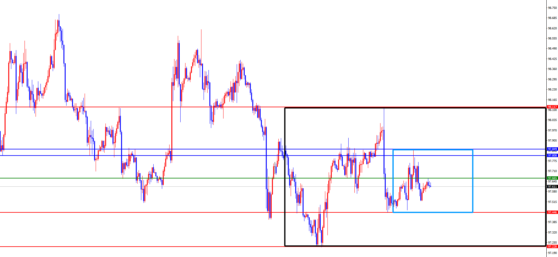 美元指数 在美元指数的表现上,周四美元指数呈现出下跌的态势。当日美元指数价格最高攀升至98.119的位置,最低则下探至97.446位置,最终以97.522的价格收盘。回顾周四市场表现,在早盘期间价格短线先维持上涨状态,之后价格如期测试到日线及周线阻力区域,同时美盘后借助数据价格快速承压,最终日线大阴收尾,