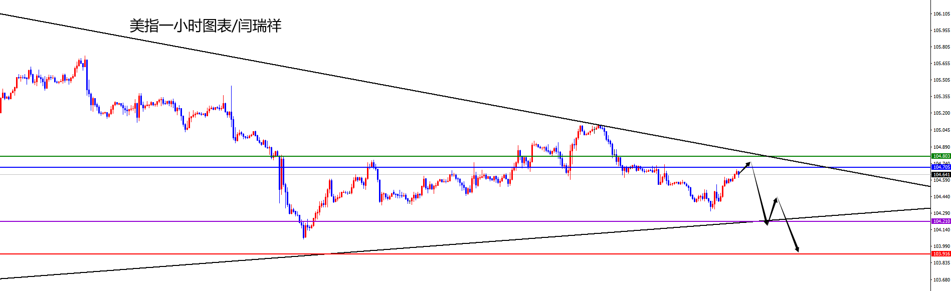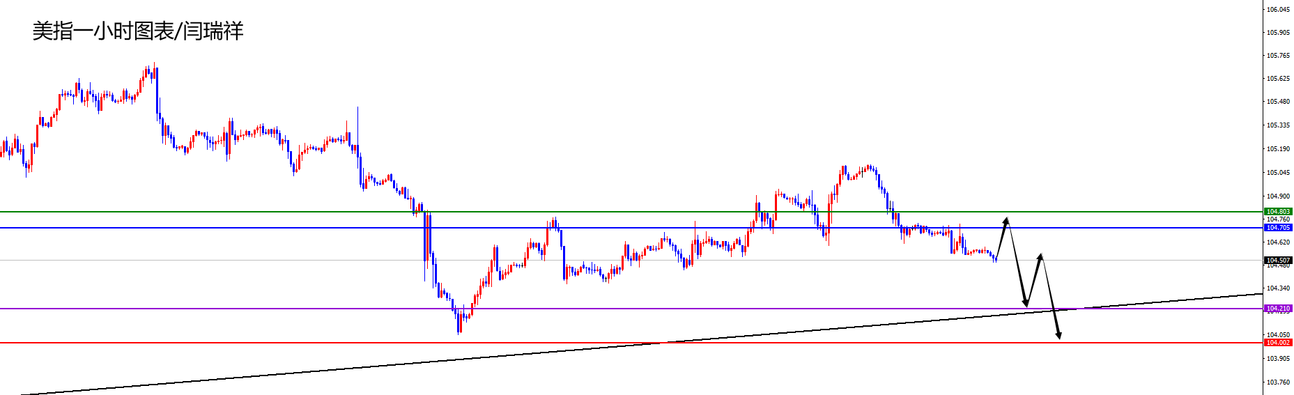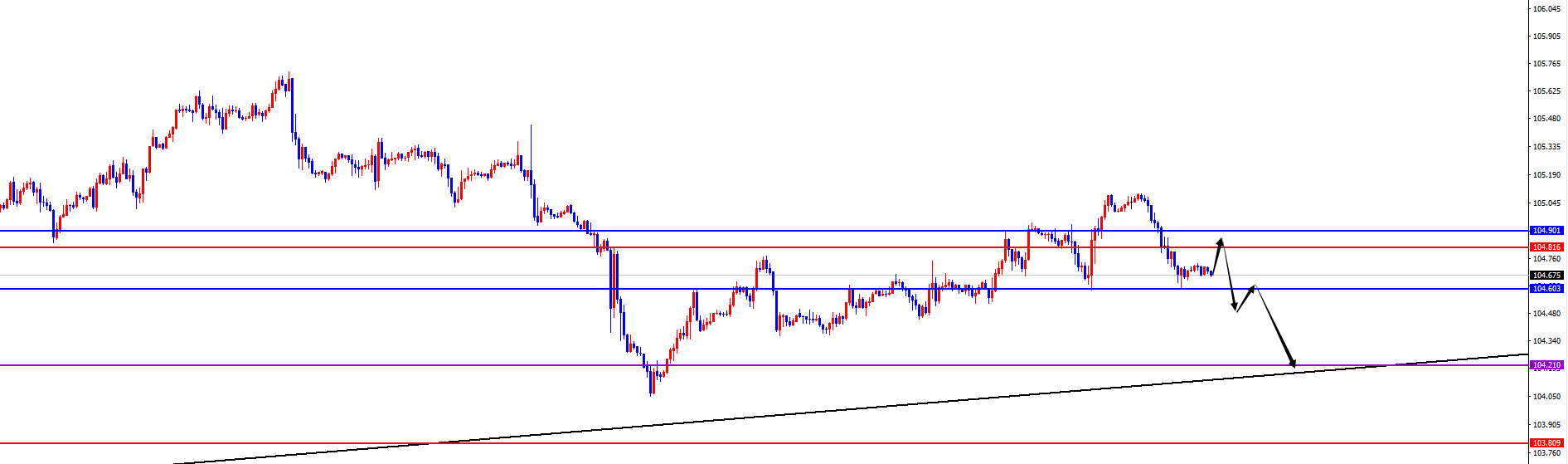 【美元指数】 美元指数方面,周二美元指数价格总体呈现探底回升的状态。当日价格最高上涨至104.618位置,最低于104.308位置,收盘于104.599位置。回顾周二美指价格表现,早间开盘后价格短线承压下跌,美盘开盘后价格短线止步上行,随后隔夜价格再度测试早盘高点位置,目前看美指价格处于周线阻力及日线阻力下方