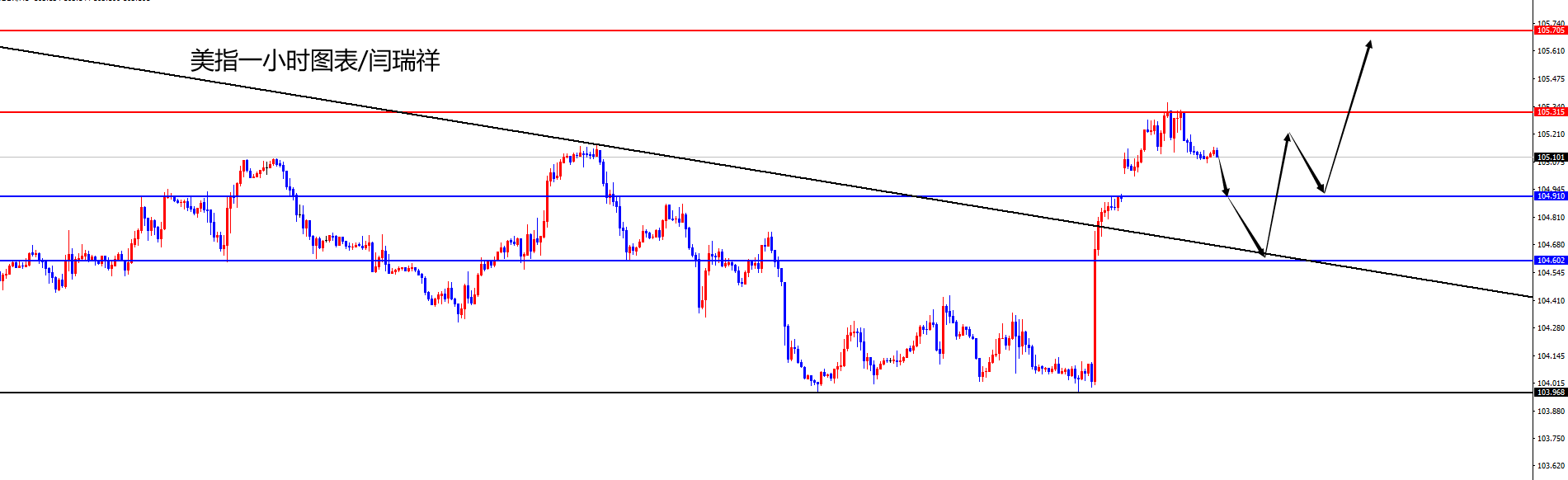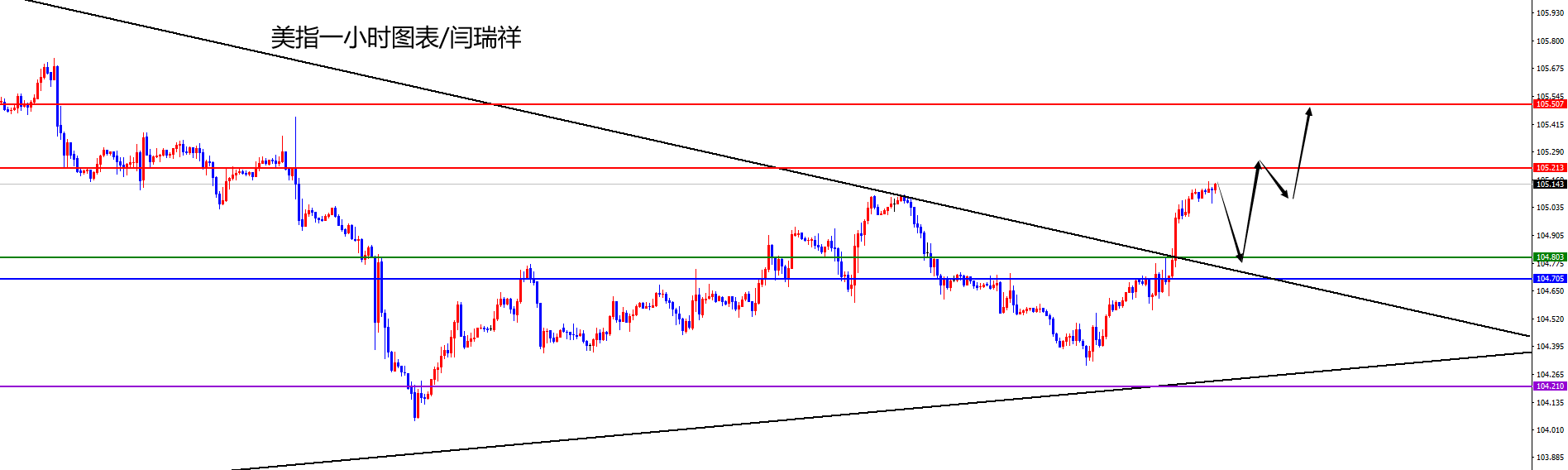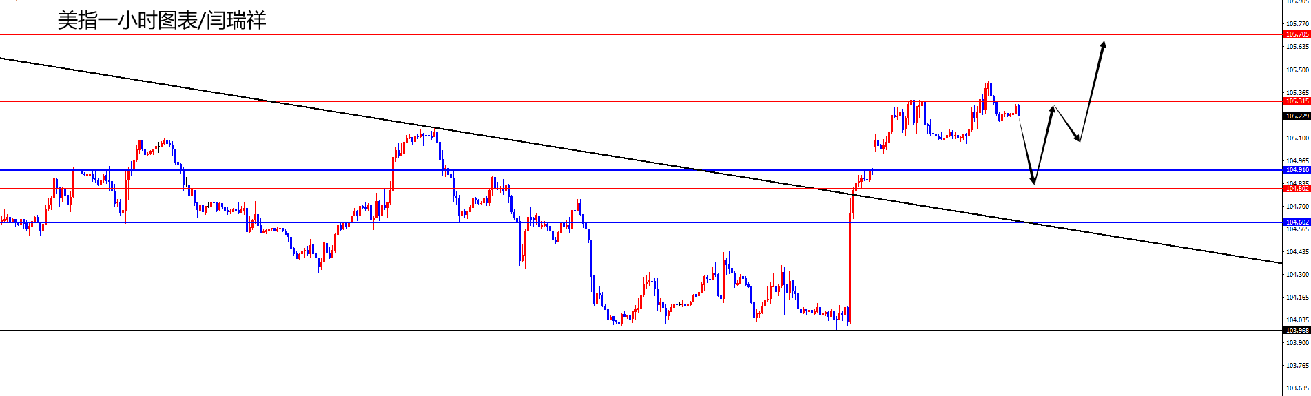 【美元指数】 美元指数方面,周三美元指数价格总体呈现上涨的状态。当日价格最高上涨至105.118位置,最低于104.562位置,收盘于105.105位置。回顾周三美指价格表现,早间开盘后价格短线直接上行,随后欧盘价格再度测试早盘低点位置后上涨,美盘期间价格大幅拉升,价格站上周线及日线阻力104.70-80区间,则此位
