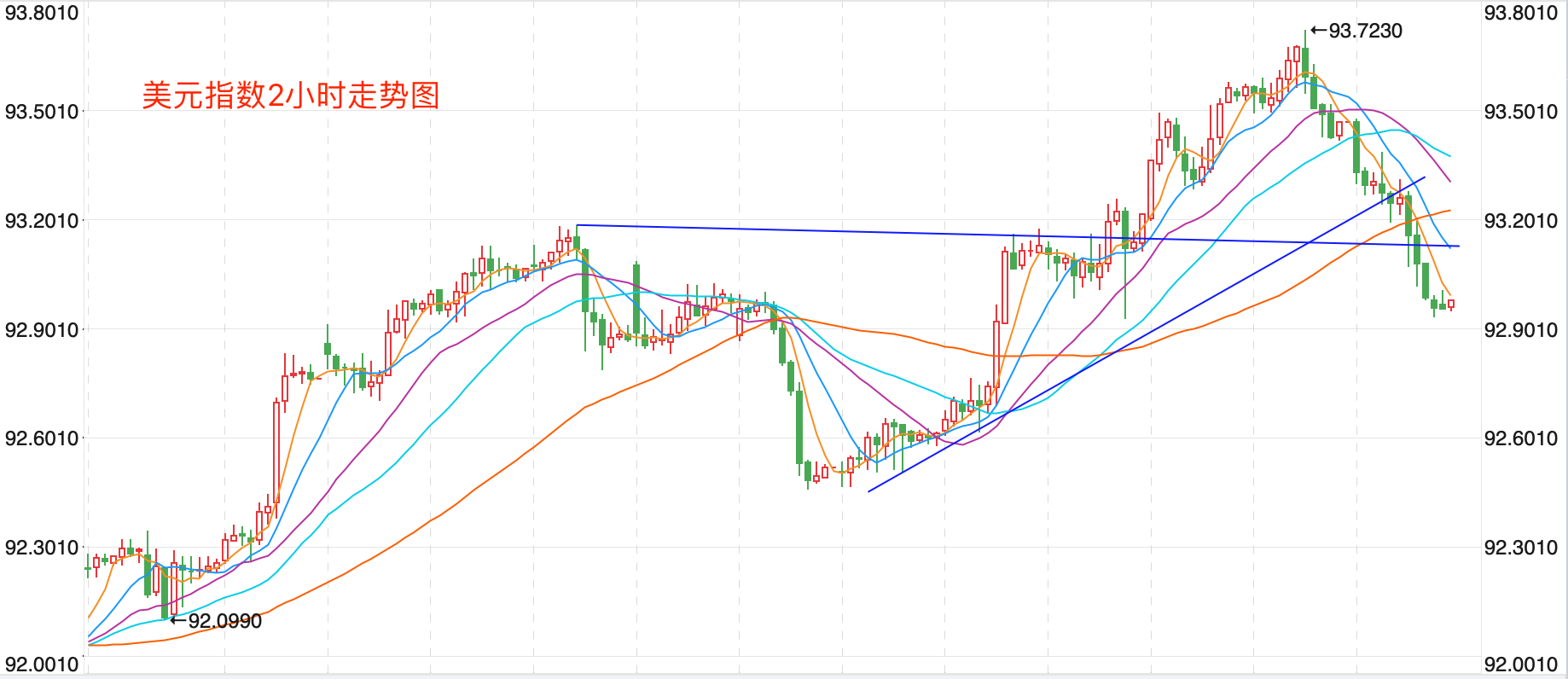 前期持续上涨创出102.99点的高位后一路震荡回落走低,触及89.206点的低位后,开始向上持续震荡走高;整体价格在MA200上方运行。中期走势继续保持震荡向上的走势,价格突破93点的关键阻力后打开上行空间。当前行情日内有回落测试92.3支持的趋势,不破93.3则高位震荡调整。