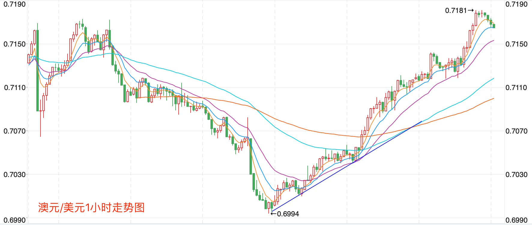 前期自2020年3月底企稳0.5673低点开启上涨走势;盘中突破了MA200均线的关键阻力而上行走高;2021年2月触及0.80072点高位后开始震荡走低,8月底企稳在0.7114点展开反弹走势再度终结,目前重回8月低点调整走势。当前日内行情有继续向上反弹的趋势。
