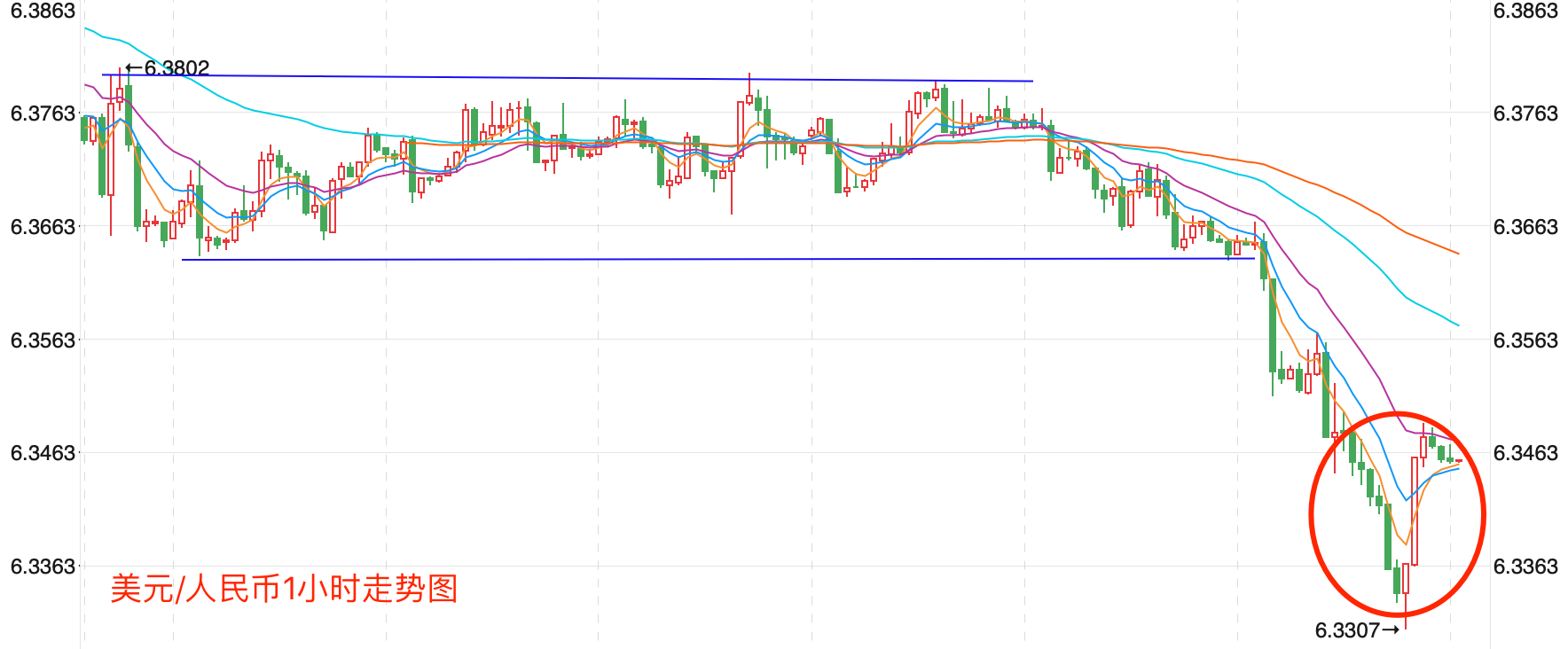 离岸价前期自2020年5月高位7.1964开启下跌走势,盘中跌破MA200均线的关键支持而下行走低;2021年5月触及6.3477点低位后开始震荡走高。当前行情日内有探底反弹的趋势。