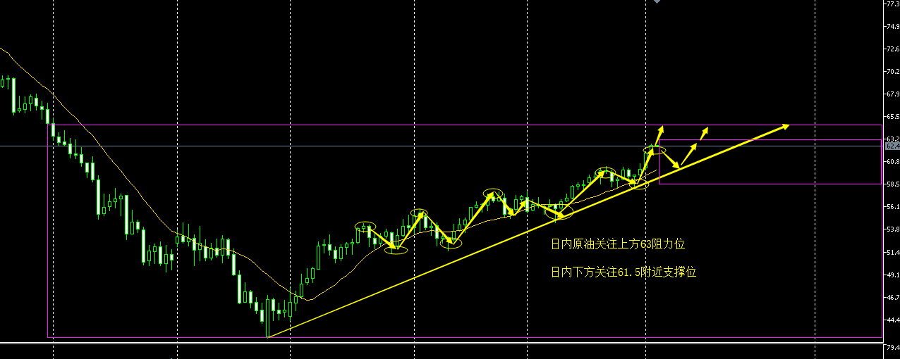 原油昨日进一步无阻力大阳线上涨。开盘即是高点,亚盘整理过渡蓄力。欧盘至美盘直接发力走高,行情早盘开盘在61.6的位置后震荡后行情在欧盘开始拉升,盘中破位前期高点62的位置后行情加速拉升,最高触及到了62.7的位置后行情整理,日线最终收线在了62.5附近的位置后收线,而这样的形态收尾后,今日开盘平盘在62.5附近震荡。实时建议会在给出目前势头看上去依然强劲,日图连续放量,多头趋势暂时保持良好。点位上,今日我们的长线空单就需要缓一缓在考虑,原油短线触及周线60日均线62.8附近后短线会有所停顿,预计会小幅回踩62.5-62.3附近继续上行,那么接下来的关键压力点就需要关注62.8-63-63.3这个三个关键节点的真假承压情况,周线级别触及月线趋势线压力附近,后市不破就会震荡下跌,多头还有最后一次能量,所以今日思路低多为主,高空为辅,布局上
