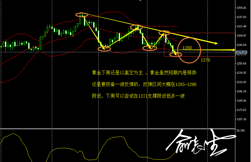 技术面上本周收盘时段黄金依旧承压于1280下方,日内最低触及1271美元,创近期最低水平。金价仍旧保持弱势震荡的局面,虽然空间没有进一步拉开太大,但是昨日虽然有所反弹但是反弹力度也是明显不足,目前依旧处于1270-1280区间震荡,日线上看,目前金价以5阴一阳的形态沿着布林带下轨运行,布林带开口呈打开形态,从指标上看,KDJ指标形成死叉向下运行,MACD双线于0轴下方交叉向下运行,下行动能呈放量形态;