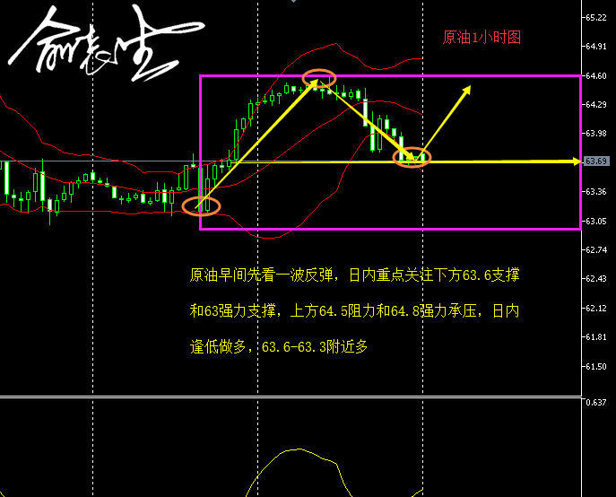 目前的油价经过几个来来回回继续宽幅震荡于63.00-64.8区间,我们还需耐心去等待进一步突破。技术面看周线走出7连阳,可以看出大周期油价依旧强势,但是由于日线连续的盘整多次未能上破64.8-65区域,处于一个关键的节点,随时会存在变盘的可能,此外短周期技术指标存在回落的需求,因此俞袁生认为在没有消息面利好影响下,实时策略会给出还是会走出新一轮的震荡偏弱行情。至于操作上,目前没有明显的涨跌,我们需要耐心等待机会出现,周初暂时以64.8-63区间,维持高抛低吸的思路。综合来看,下周一操作思路上俞袁.生个人建议以反弹高空为主,回调做多为辅,上方压力短期关注64.6-64.8一线阻力,下方关注63.0-63.2一线支撑。