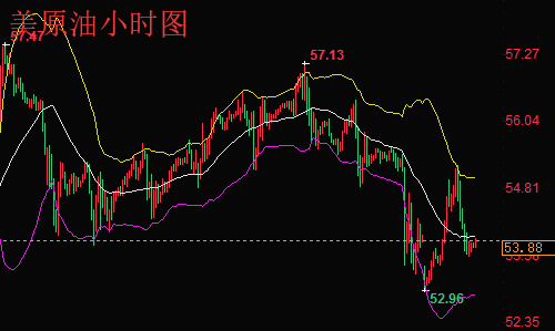 原油上周五连阴下跌日线录得一根带下影线的大阴线,日线上,低点不断变高,高点不断变低,形成对称三角形形态,待确定形态;从四小时图来看,四小时图上上周五开盘以来油价承压连阴下跌,陈文龙目前结合行情来看当前布林带处于开口形态,MA均线呈空头排列,K线延下轨运行之中,KDJ指标三线向上即将并拢,MACD指标绿色动能柱持续放量,快慢线向下前方延伸,油价在受消息面影响后连阴下跌后昨日短期反弹上涨修正。最高反弹55上方,后半夜持续走低,所以原油如果没有消息面的刺激还是偏于下行。综合来看,今日操作思路上陈文龙个人建议以反弹高空为主,回调做多为辅,上方短期重点关注54.6-54.8一线阻力,下方短期重点关注52.8-53.0一线支撑。