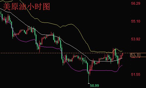 原油日线图来看一直是持续收阴,最近的原油只要是反弹就可以做空,周四原油也是再次破位新低连阴下跌,日线上技术面空头趋势明显,整体看空不变;四小时来看,连连阴下跌,可是昨日触及51低位后,紧接着收得一根小阴十字星再转阳反弹上涨,随后午夜拉升到52上方,从四小时图看,周四原油试探低位51附近之后企稳反弹,晚间也是持续走高到53上方,目前可以初步判定原油下方支撑很强,目前布林带朝上运行,K线运行与布林上轨附近,MA5与MA10死叉向上,MACD金叉向上,绿色能量柱二次放量,KDJ三线粘合运行,行情多头趋势企稳。综合来看,下周一短线操作思路上陈文龙个人建议以回调做多为主,反弹高空为辅,上方短期重点关注53.8-54.0一线阻力,下方短期重点关注51.8-52.0一线支撑。