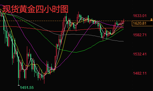 现货黄金从4小时来看,区间震荡;金价近期维持在1575-1645区间震荡,若该区间不能突破,可维持高抛低吸,或是等待决定性突破指引。上方方面,先关注上方1630美元一线,这是布林带上轨处,对价格上行有一定阻力,上破后重点关注1645美元一线,这是震荡区间的上轨,此前经过多次测试,具有较强的参考价值,若上破,进一步打开上行空间,阻力位上看前期高点1703。