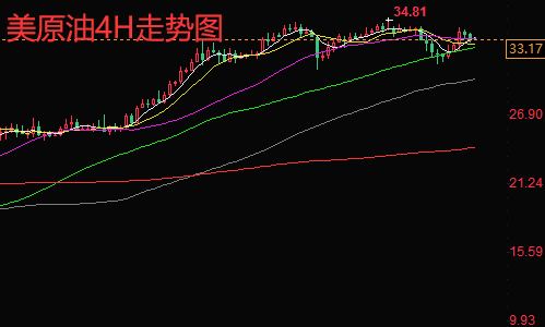 原油4小时线来看K线只从上周五回落至30.50后筑底反弹上涨,K线就一直处于单边震荡缓慢上行阶段,技术面分析来看MA5与MA10均线企稳于33.0再次形成金叉缓慢上探走高,KDJ与RSI均线三线并行上扬。整体来看原油还有一点多头未走完但是空间不会太大,追多的朋友需谨慎防止大幅冲高回落。综合来看,今日短线操作思路上陈文龙个人建议以回调做多为主,反弹高空为辅,上方短期重点关注34.3-34.5一线阻力,下方短期重点关注32.0-32.2一线支撑。