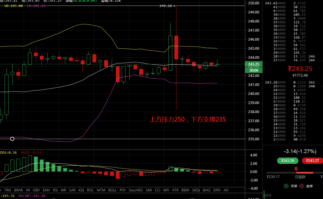 以太坊的走势和大饼相似,同样是早上冲了一波高点,快速下跌最低到了238这个位置,上下一针,点位没变,同样是一个低点上移的一个走势。从四小时以及日线级别上来说,大的趋势依然还是多头有优势,那么还有一点就是以太2.0现在为市场的一个热门,是值得我们关注的。短期内不管是上涨还是下跌,都没有足够的动能。上方压力250,下方支撑235,操作上还是以低多为主。