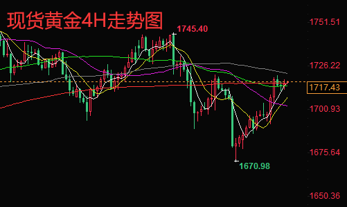 黄金技术分析:现货黄金从日线图上来看,布林带三轨逐渐发散,黄金价格运行在布林带中轨附近,均线收死叉下扬,黄金目前处于高位宽幅震荡,KDJ重新结成金叉,随机指标向上,MACD死叉,绿色能量柱缩减;现货黄金从4小时来看,布林带三轨逐渐走平,黄金价格运行在布林带中轨和上轨之间,均线收金叉上扬,黄金短期处于震荡反弹阶段,KDJ金叉,随机指标大幅走高,MACD金叉,红色能量柱持续放量;黄金上方短期关注布林带上轨1723阻力,破位继续上看1728一线,下方短期关注1710一线支撑,破位继续下看1705一线。综合来看,今日短线操作思路上陈文龙个人建议以回调做多为主,反弹高空为辅,上方建议反弹到1726-1728分批布局空单,下方建议回踩到1708-1710分批布局多单。