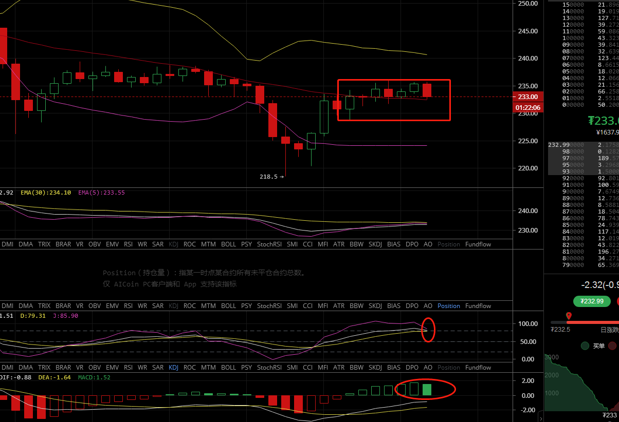 以太坊昨日上攻至235一线后开始盘整,早间向下试探了一波支撑位,再次回升至235一线,目前价格233美金附近。四小时来看布林带平缓运行,价格位于中轨附近,MA5,MA10,MA30日均线几乎粘合持平运行,综合来看还是一个震荡局面,KDJ向下拐头,绿色动能柱也开始减少,操作上高抛低吸。