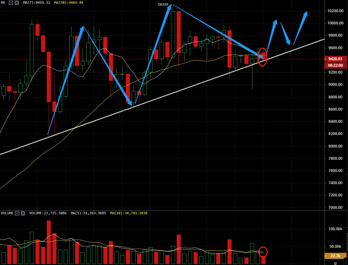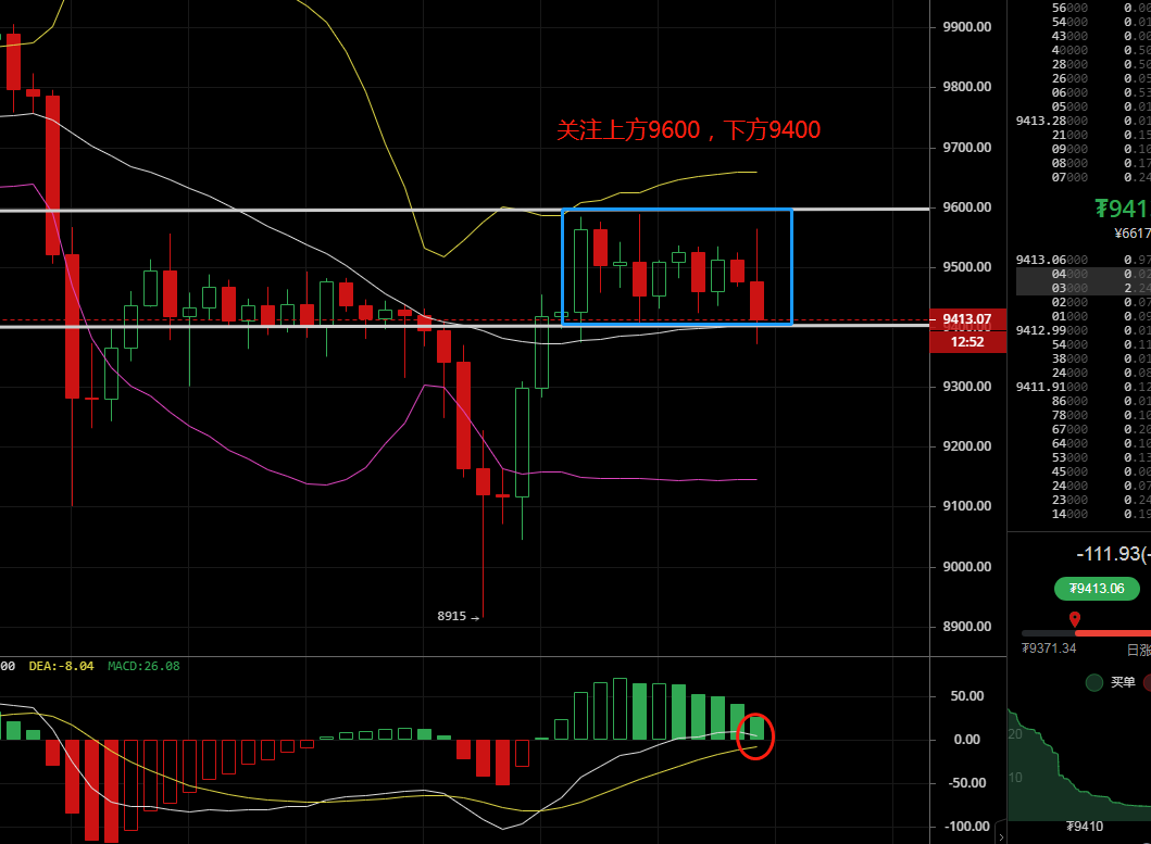 4小时来看,布林带开口向上张口,币价白天一直在中轨上方运行,虽然晚间有刺穿中轨9400美金一线的支撑,目前依然再次回到中轨上方运行,短线后市重点关注中轨9400一线的破位情况。如果24点收线在中轨上方,我们可以将9400作为一个短线的支撑,轻仓布局多单!如果收线在中轨下方,支撑将会再次下移,多单不着急进场!副图指标看,MACD快线贴近0轴运行,似乎有向下拐头的迹象,如果快慢线在0轴下方形成死叉,币价将会迎来新一波的下跌。
