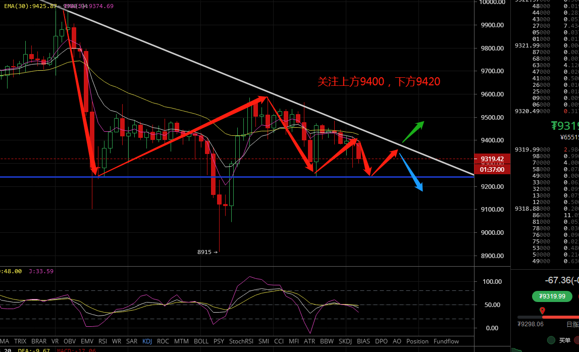比特币昨日白盘一直维持在9400-9450附近震荡,上下波动不到100美金,整个盘面平淡无奇,随着时间推移9580高点变成压力位,晚间开始向下调整,一直位于9400下方,凌晨连续插针,最低点是到了9280,目前价格9330美金附近。