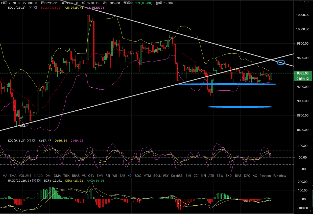 昨日日内行情两次插针9400一线都遇阻回落,摆盘基本保持9380-9330窄幅震荡,晚间再次上行至9400遇阻再次回落,日内三次试探9400压力位未能突破站稳,凌晨行情一直围绕9300附近震荡,早间8点开始拉升,涨幅100点左右,目前价格9380美金。昨日晚间给出的比特币以太坊多空均是到达目标点位,恭喜跟上的朋友。