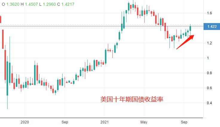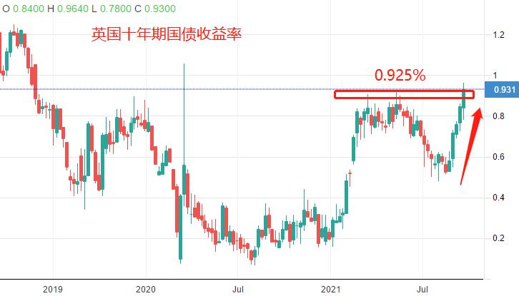 从图中可以看出,最近7周时间,英国债券收益率都处于上涨状态。并且,本月已经突破中期高点0.925 。这表明市场资金正踊跃的从避险资产中出逃,流向更高收益的资产(或者进行消费)。当然,大家一致预期市场利率会不断提高,会对英国股市形成压制作用,因为高利率对应的是股票市场的低估值。