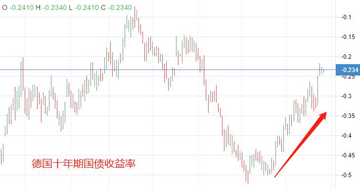 德国十年期国债处于中期上升趋势中,表明德国经济正在稳步复苏,资金的风险偏好增强,开始流出债券避险市场,流入其它相对较高风险的资产。