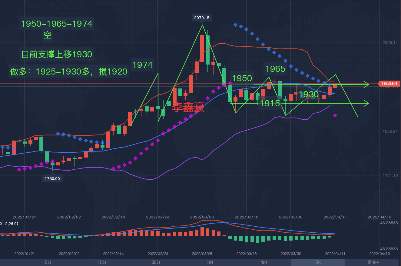 4小时上周守住在布林道下轨1915长时间整理启稳,周尾走出一波连阳式反弹。打破了窄幅整理区间,同时顶开布林道上轨。拉动均线指标拐头向上形成支撑。4小时显示短线还有适当延续性整理上扬空间,而中轨也是此前的回测的二次低点1926是强弱分界点,此位之上偏多。反之转弱,目前在中轨上方回调择机做多为主。