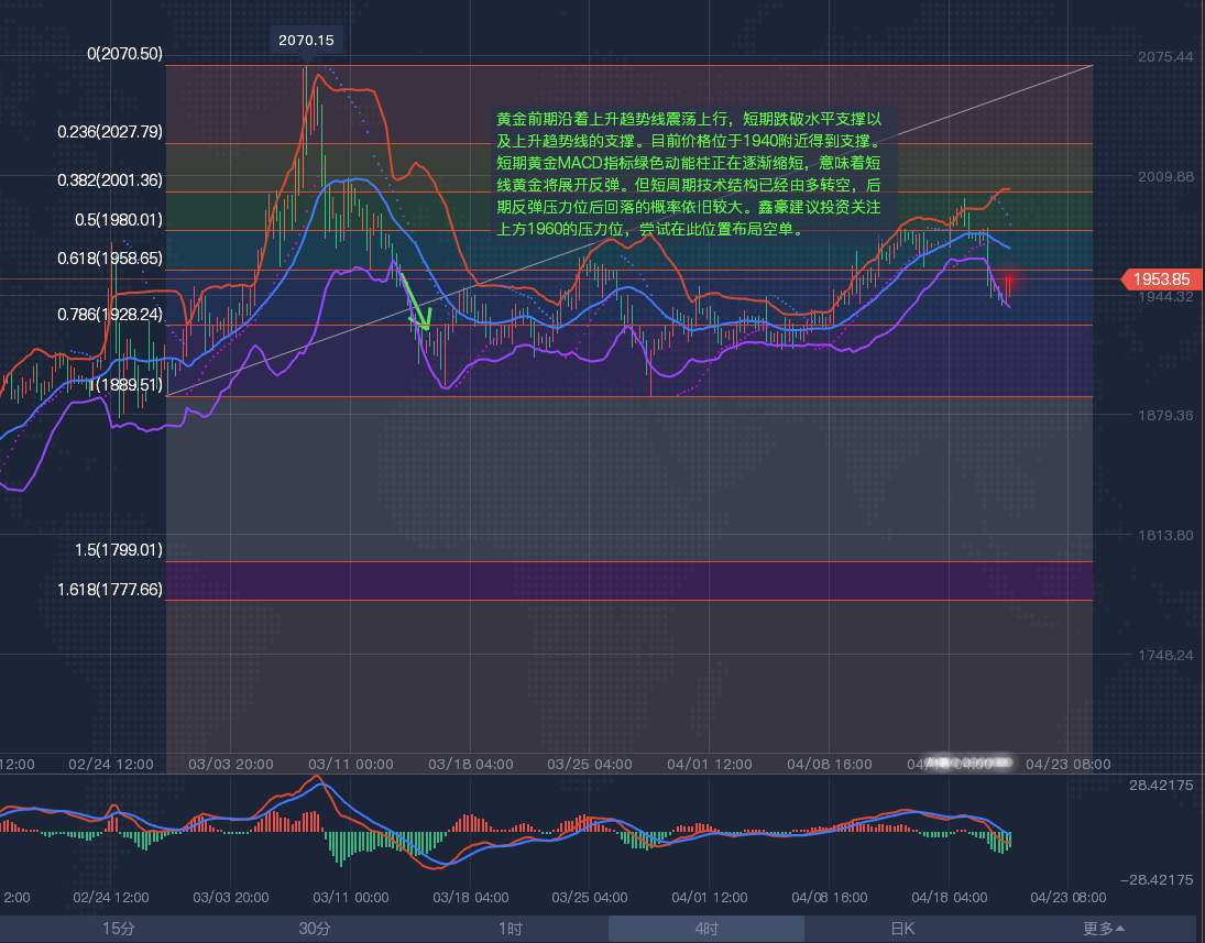 从黄金1小时周期图来看,黄金前期沿着上升趋势线震荡上行,短期跌破水平支撑以及上升趋势线的支撑。目前价格位于1940附近得到支撑。短期黄金MACD指标绿色动能柱正在逐渐缩短,意味着短线黄金将展开反弹。但短周期技术结构已经由多转空,后期反弹压力位后回落的概率依旧较大。建议投资关注上方1960的压力位,尝试在此位置布局空单。