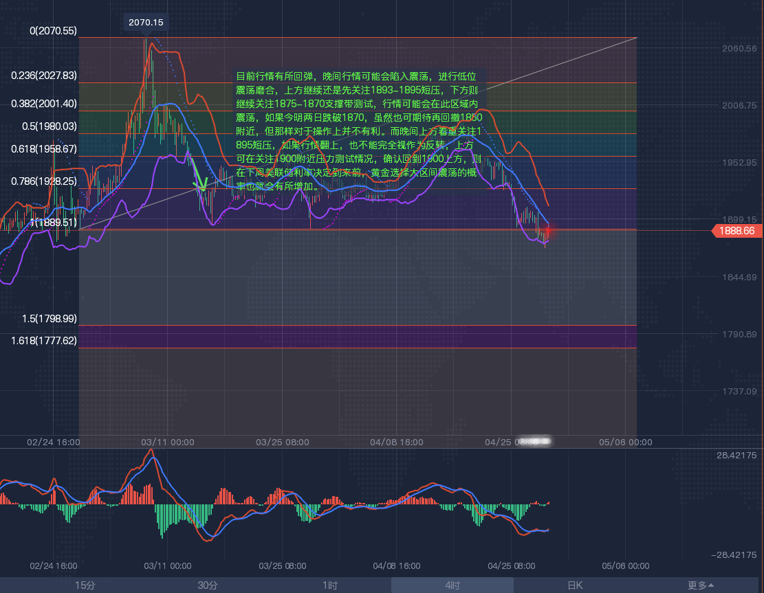 目前行情有所回弹,晚间行情可能会陷入震荡,进行低位震荡磨合,上方继续还是先关注1893-1895短压,下方则继续关注1875-1870支撑带测试,行情可能会在此区域内震荡,如果今明两日跌破1870,虽然也可期待再回撤1850附近,但那样对于操作上并不有利。而晚间上方着重关注1895短压,如果行情翻上,也不能完全视作为反转,上方可在关注1900附近压力测试情况,确认回到1900上方,则在下周美联储利率决定到来前,黄金选择大区间震荡的概率也就会有所增加。
