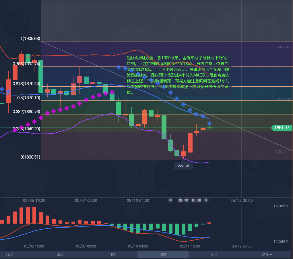 短线4小时方面,自1909以来,金价形成了阶梯式下行的结构,下跌结构的顶底转换位在1852,日内注意此位置的实体突破情况,一旦4小时突破此,将说明4小时1909下跌波段的结束,届时预计将形成4小时的MACD三段底背离的修正上涨,下跌动能衰减,布局方面注意晚间在短线1小时找关键位置接多,1832注意是本次下跌以及日内低点的可能。