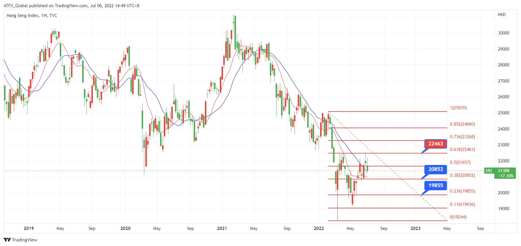 以下是恒生指数周图, 恒生指数自周二触及22463点后走势逆转, 并连续两天下跌, 周三跌幅扩大跌至20周在线。 技术上恒生指数可能下试10周线于21032支撑位。 若突破该位, 恒生指数可能下探该次反弹浪的38.2%支持位20852。