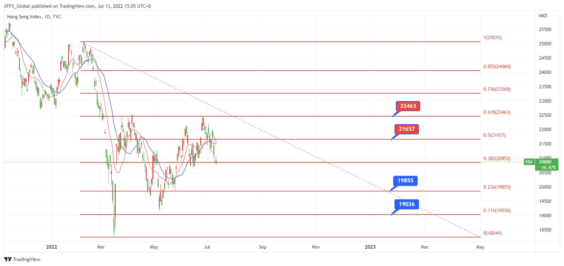 ATFX恒指追踪:亚洲股市周三开盘上涨,曾经收复近期的部分跌幅,但在晚间备受期待的美国通胀报告发布之前,亚洲股市午后全线转跌。在美国6月份通胀数据公布之前,大多数举措都显得微不足道, 路透社调查的经济学家预计,该数据的年增长率为 8.8%,为40年来的峰值。美联储可能会将高通胀数据解读为他们需要继续大幅加息以克服物价飙升的迹象。即使加息可能导致全球经济增长放缓, 更可能会将经济推入衰退, 但相信政策决策者在高企通胀环境下美联储在本月27日的会议上将利率再提高75个基点。今年美联储自3月始一直加息是今年股市下跌的主要因素,若高企的通胀持续, 相信7月之后再有两或三次加息50基点至75基点至局方认为通胀受控时候, 加息步伐才会结束。