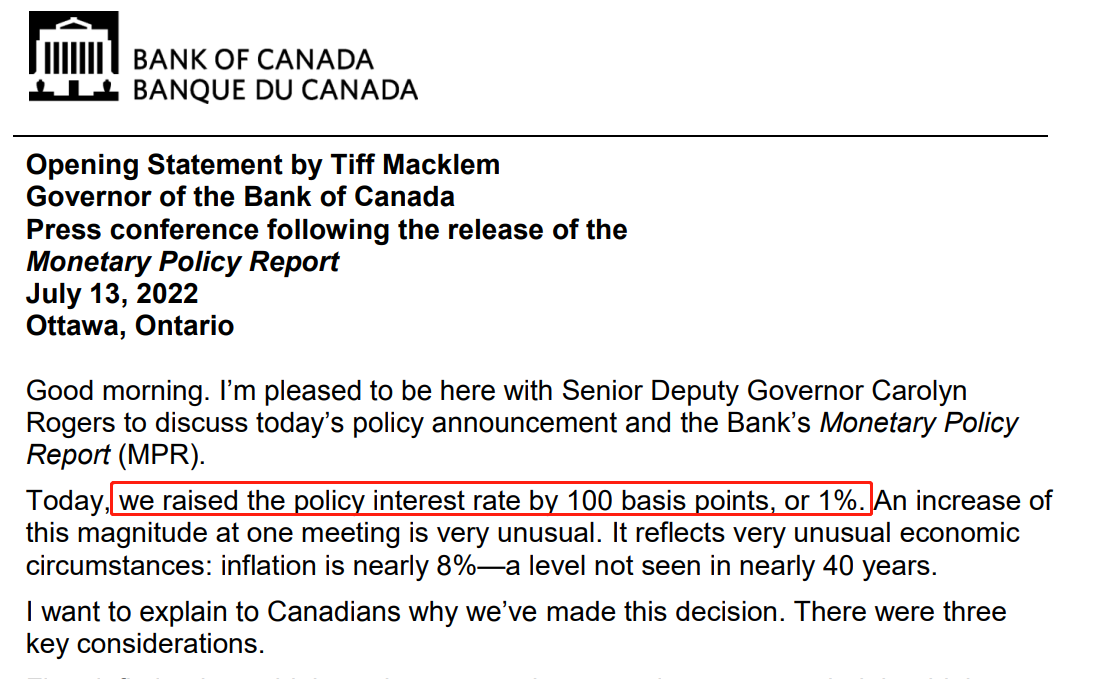 当地时间13日,加拿大央行宣布将基准利率提高100基点至2.5%,并称,如此高的单次加息幅度并不常见,目的是抑制40多年来最严重的高通胀问题(5月份CPI最新值7.7%)。