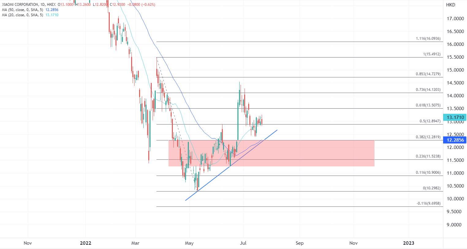 在国内外市场表现均欠佳的环境下,小米(01810)股价自今年1月高点已经累计下滑超过三成,如果下半年的核心盈利未能如预期改善,股价可能再度跌向12港元下方,11-12.30是此前交投密集的区间,可以视为支撑范围,阻力则看13.50至14.50。