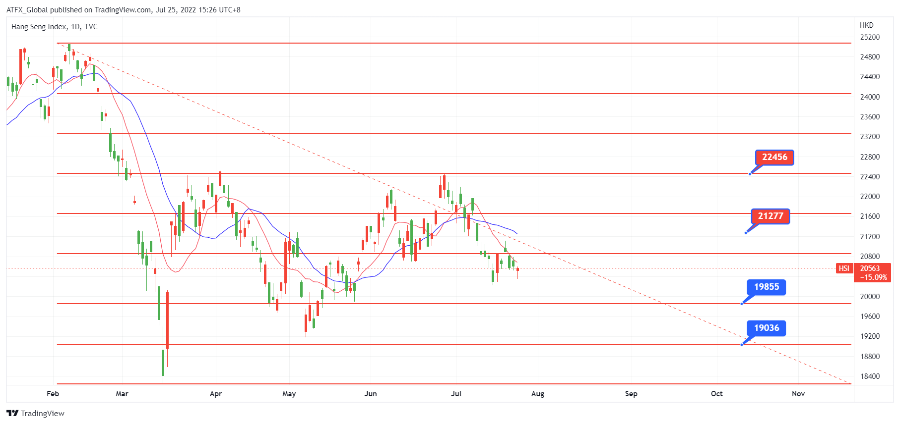 ATFX恒指:由于对全球经济下滑的担忧削弱了投资者的风险偏好,亚洲股市周一下跌,从逾三周高位回落。美联储议息结果宣读前经济衰退担忧导致亚洲股市随着债券收益率下滑。债券收益率回落,因投资者押注美国经济衰退将减缓美联储激进的紧缩政策,市场从周二开始的为期两天的联邦公开市场委员会会议中寻找政策线索。与此同时,美元兑主要货币从 2周半低点反弹,受到对美元避险需求的支撑。 纳斯达克期货基本持平,在科技股重股指数下跌1.77%之后, 香港恒生指数下跌 0.75%,科技指数下跌 1.96%。香港恒生指数中表现较佳的主要板块集中在内房股及矿业股。另外, 澳门赌业股在连续一周下跌后, 因澳门疫情受控, 作为澳门主要收入来源的娱乐机构有买盘承接, 其中银河娱乐及美高梅中国表现较佳。但留意一连两天的美联储议息会议从周二召开, 市场对储局7月会议加息75基点的意愿较高, 若加息幅度大于此, 可能触动环球股市下跌, 间接影响香港恒生指数。但以上提及股份可能受惠其他利好预期, 支持股价向上。