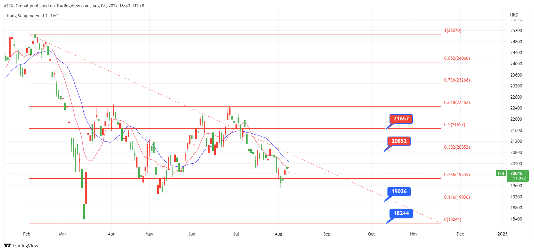 ATFX恒指:亚洲股市因对美联储进一步收紧政策的预期升温而回落, 加上因投资者消化来自中国的贸易数据,中国股市周一下跌,中国沪深沪深300指数下跌0.2%, 港股周一开盘低开, 最多下跌逾180点。中国7 月份进口增长弱于预期,引发了对当地需求的疑虑。不过上证综合指数上涨 0.2%,因出口增幅高于预期工业股提振。外围方面, 自美国7月就业数据表现较预期强劲, 一些美联储官员的鹰派言推高美国国债收益率和美元之后令美股三大指数承压。交易员现认为, 美联储将在 9 月的下次会议上再加息75个基点的可能性由原先约为 44%升至70%, 这些因素触动交易者情绪, 进埸态度审慎, 个别投资者见美国下月加息幅度可能较预期大, 交易股份中主要集中受惠息差优势的银行股。香港本地银行股如汇丰银行(0005), 渣打银行(2888)升幅近1%, 中银香港(2388)及恒生银行(0011)升近0.5%。内银股方面, 中国银行(3988)及工商银行(1398)分别升0.7%及0.5%。邮储银行(1658)外, 其他内银股也录得升幅。因美国可能手扩大加息步伐, 新经济股及半导体股股价受压, 其中半导体股跌幅较大, 上海复旦(1385)跌幅逾4.6%。十大最活跃香港股中, 新东方在线(1797)跌近10%, 阿里巴巴(9988)连续一周下跌, 周一再跌逾4%, 港股造价跌破90港元, 收报88.8港元跌幅为4.41%。另一重磅香港新经济股腾讯控股(0700)周一突破300港元大关, 收报299.4较上周五收市下跌2.67%。以上重磅蓝筹股继续受压, 相信港股走势仍然利空。