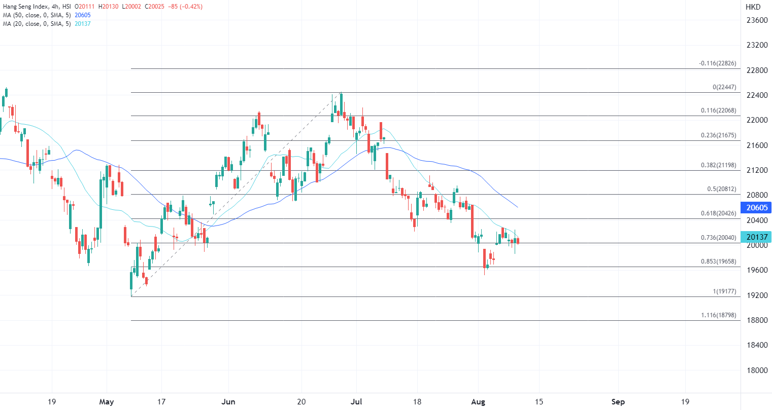 恒指日内持续在20000点关口附近反复,4小时图一度逼近上周高位,但再次在20200上方遇阻,加上20均线充当障碍,在缺乏特别指引的情况下,继续赶住在低位范围的盘整,尤其未能突破至20400上方的情况下,可能继续反复并下测19600的低点。