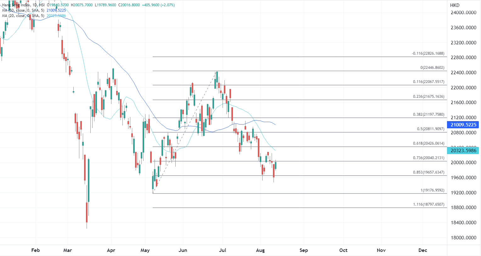 ATFX指出,今日港股走势回顺,走日最低下探19500下方后回升,配合日内情绪改善而反弹,但在突破20均线前说恒指已经脱离低位为时尚早,尤其是在20000点关口附近的胶着可能持续。