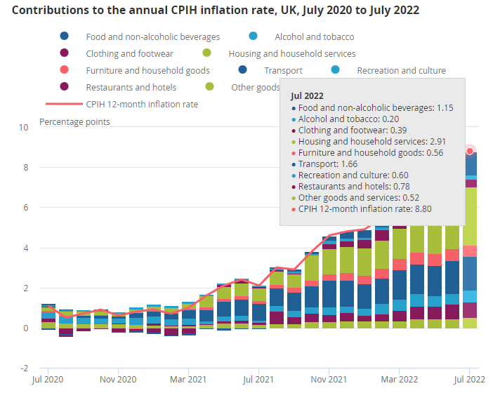 英国有两项消费者物价指数,分别为CPI和CPIH,前者是投资分析通用指标,后者因为包含自有住房的成本(亦即OOH,约占CPIH的17%),所以被英国统计局看重。7月份英国CPIH增速8.8%,高于前值8.2%,对物价上涨贡献最大的是住房和家庭服务(主要来自电力、天然气),其次是交通费用(主要是燃油),最后是食品和非酒精饮料。7月份英国CPI增速10.1%,高于前值9.4%,驱动CPI上涨的因素与CPIH基本相同。