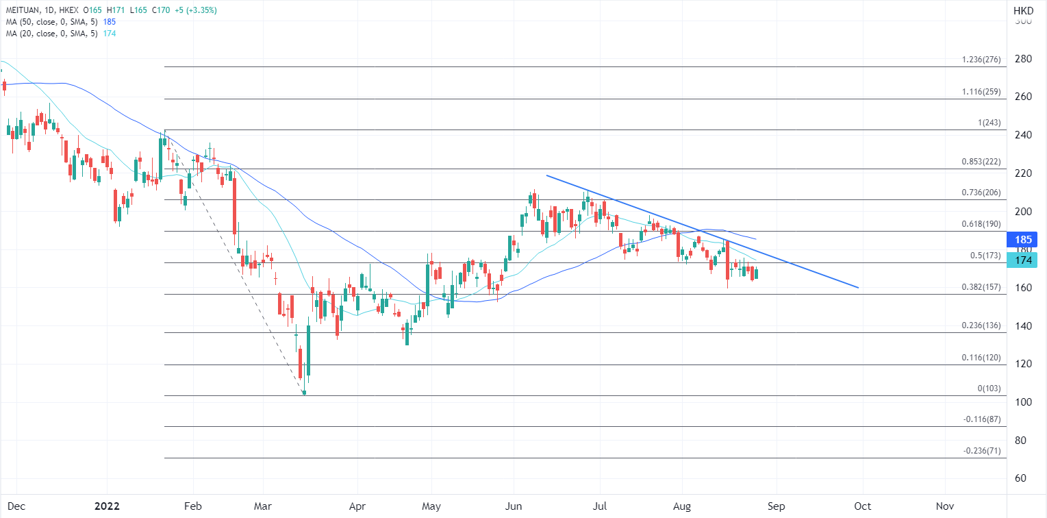 ATFX港股:美团(3690.HK)将在本周五(8月26日)发布第二季度财报,虽然4、5月部分地方的疫情风控,但预计中期净亏损有望收窄。周四绩前美团股价盘中上涨逾3%,有望扭转前两日的连跌势头。