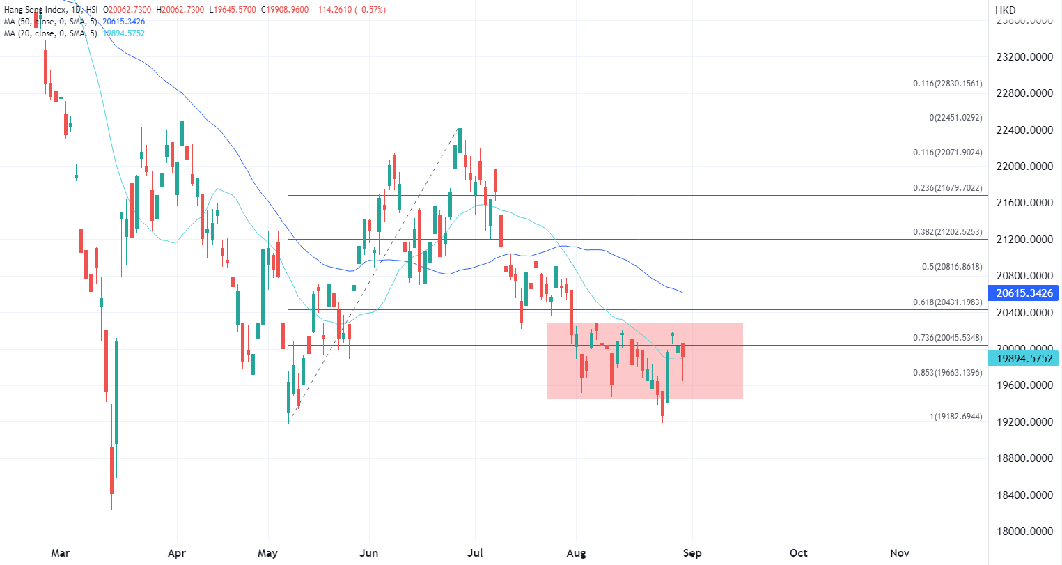 如ATFX此前指出,港股业绩已经接近尾声,传统的高息股整体保持了稳定的派息,对股价相应带来支撑,包括中石油、太平洋航运、信义玻璃、中国海外发展等。本月港股震荡不少但缺乏起色,单月基本维持在区间内的行情,如果周三未能收于20000点关口上方,月线免不了两连跌,进入9月或有疲惫行情承接。