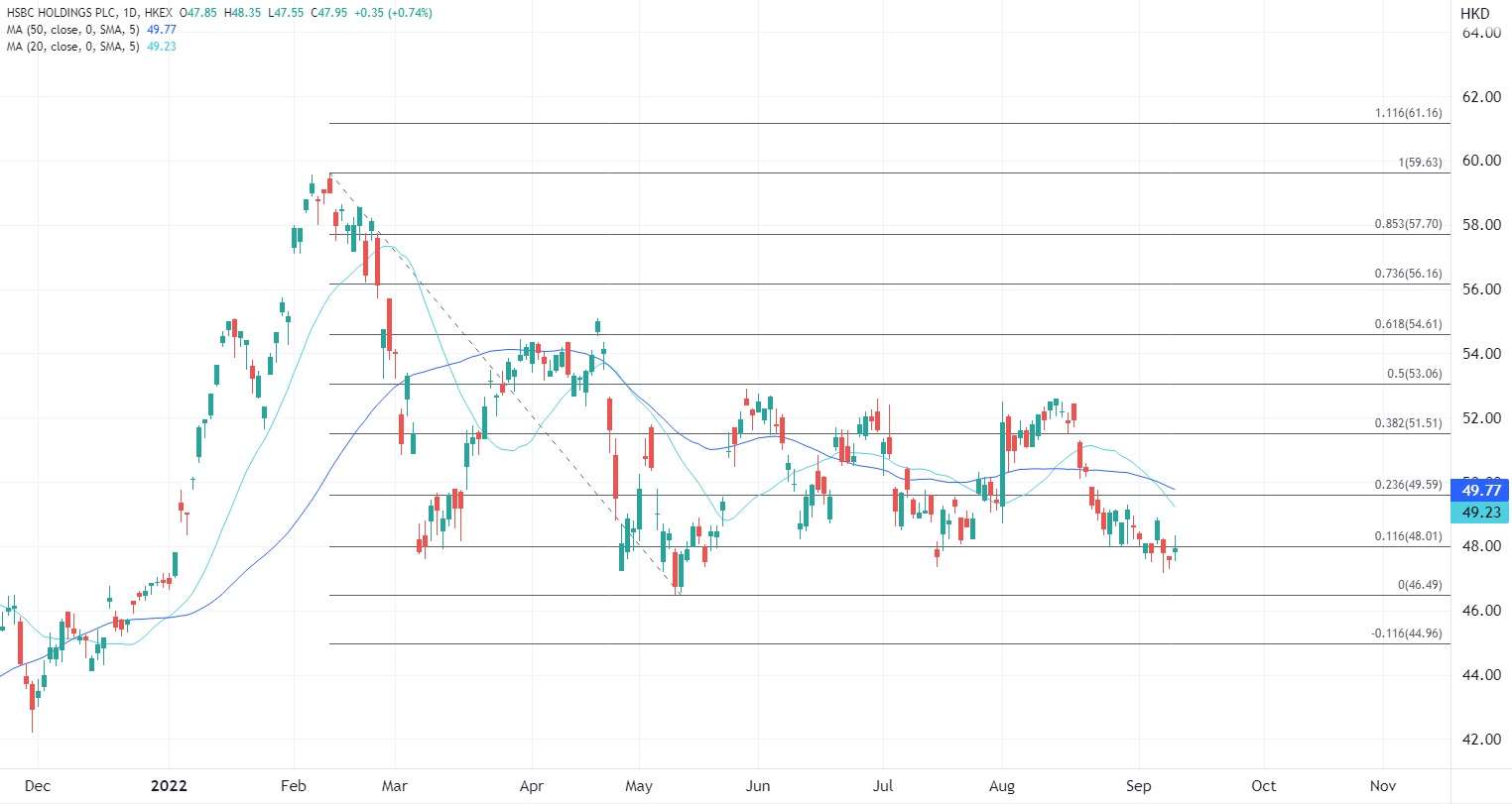汇丰股价本周并未跟随调息而获得支撑,反而连跌两日后今日跟随大市改善,日内上测48元后遇阻,在未能摆脱近期低位的情况下,仍可能再度走弱指向5月低点46.48元。阻力方面,突破49.60元将是重启信心的关键。