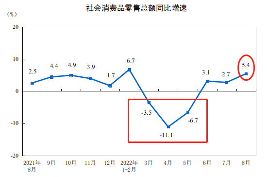 据统计局数据,8月社会消费品零售总额同比增长5.4%,高于7月份的2.7%,表明消费力依旧旺盛,内需持续复苏。1至8月社会消费品零售总额同比增长0.5%,高于前值-0.2%,虽然0.5%的增长不算高,但已经抹平3-5月份的月度负增长,部分悲观预期得到逆转。不过,2021全年社会消费品零售总额增速12.5%,单月最高增速34.2%,今年的数据远未达到去年的高增速状态。