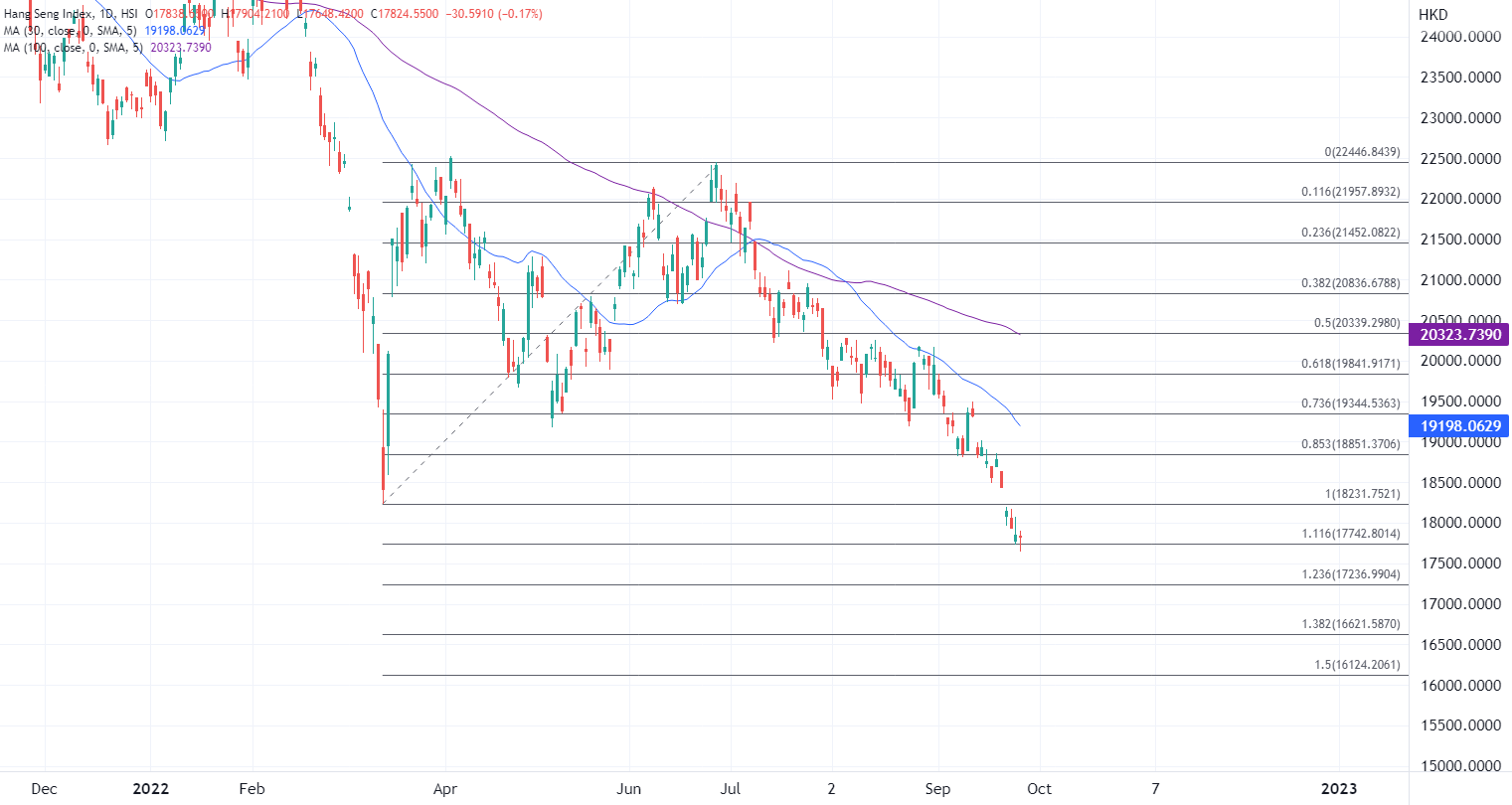 ATFX分析,本周即便香港宣布放宽出入境政策,港股却反应平淡,仍进一步跟随外围对于经济的恐慌而走低,本季度已经无法避免连续五个季度收跌的行情,也是2009年以来的最长连跌。本周美国即将公布众多数据,足以间接影响恒指本月收官表现,而且月末一般行情震荡,加上内地和香港假期,可能部分投资者选择调整仓位,恒指预计维持低位震荡。