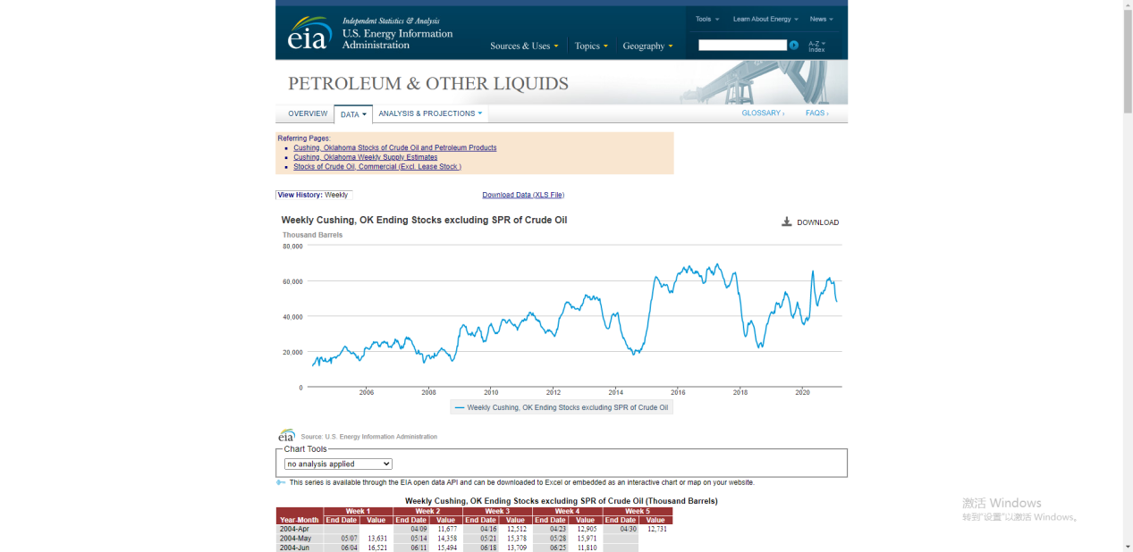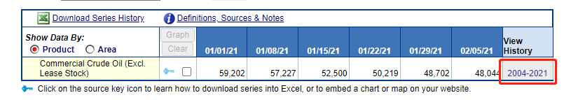 自此,我们就完成了EIA原油库存数据的查询,原油交易者可以根据自己的需要对该页面中的EIA曲线和表格进行自由处理和分析。需要提醒的是,原油库存曲线下有写到“excluding SPR of crude oil”,意思是该库存曲线不包括美国战略石油库存。