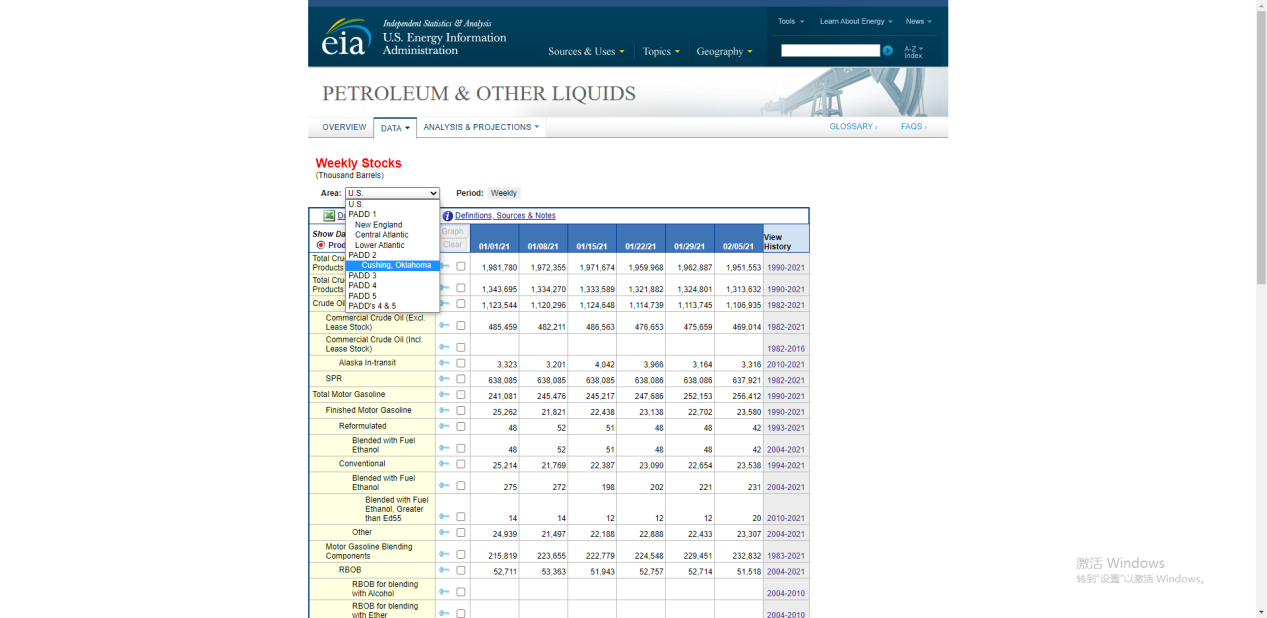 俄克拉荷马州简称OK,位于原油管理局划分的PADD2区域内。俄克拉荷马州的库欣地区是美国原油库存主要区域,所以在Area复选框中,选择PADD2(Cushing,oklahoma),之后就找到了EIA原油库存数据的列表,如下图: