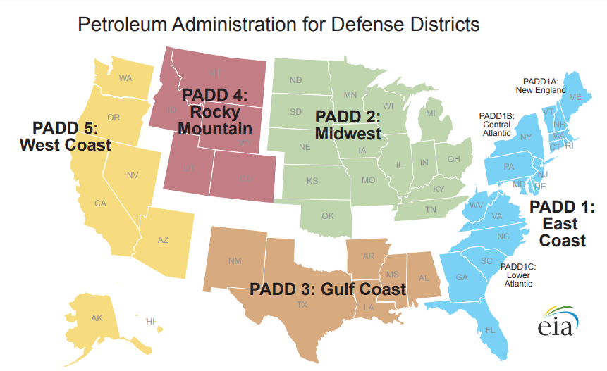 左上角存在复选框,名称为Area(区域),其中的选项包括PADD1~5,这是对美国全境进行了五个板块的划分。PADD英文全称为:Petroleum Administration for Defense Districts,直译为石油管理局对区域的划分。简单来说,PADD1代表美国东部沿海,PADD2代表美国中部偏东地区;PADD4代表美国中部偏西地区;PADD3代表美国南部地区;PADD5代表美国西部沿海地区。更加直观的划分方法如下图: