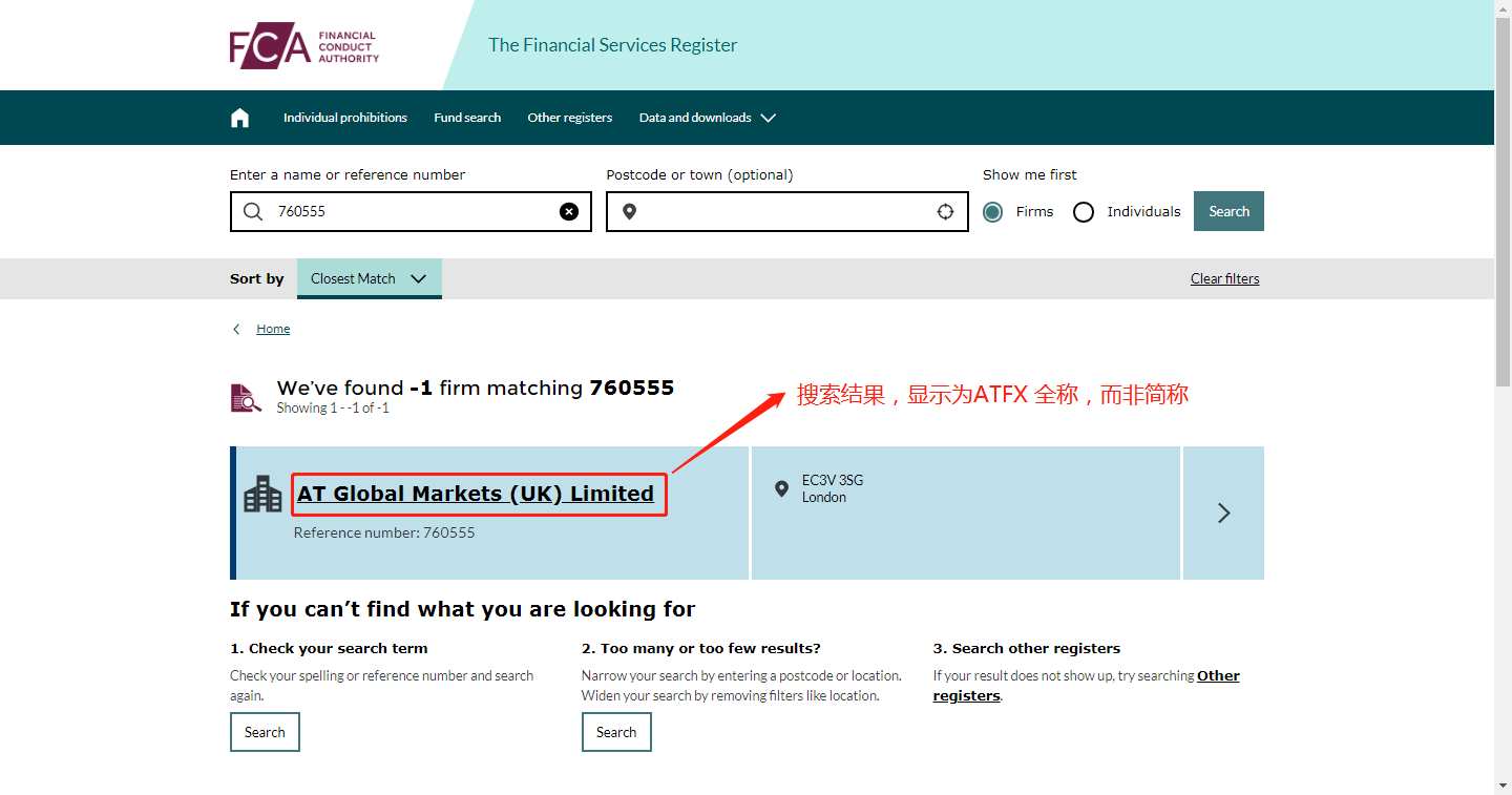 3、搜索完成之后,会直接显示对应的经纪商名字全称和监管号码。如果搜索结果为空,则代表该公司没有受到FCA监管,自然也不会受金融行为监管局约束,此类经纪商的业务风险较高。