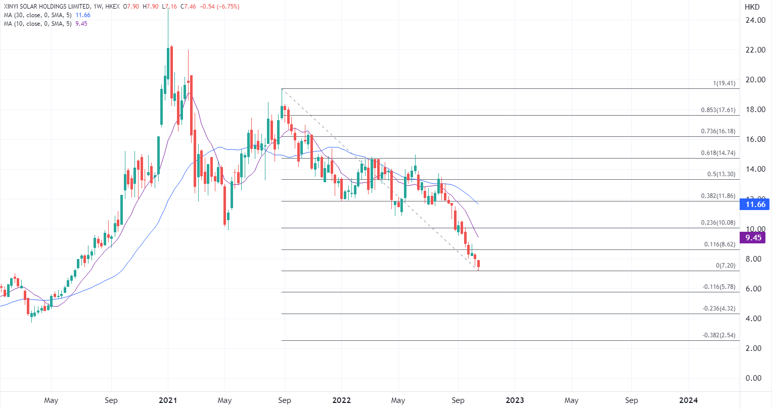 而信义光能虽然主要的盈利贡献在中国市场,下游市场需求可以带动其盈利在第三季度回升,但其出口产品也覆盖全球多个国家,更加容易受到外围宏观环境的影响,在短期内会增加股价的波动因素。技术上从周图看,当前股价最低接近7港元,该位是2020年2月高位阻力现转为支撑,但价格需要突破10港元才能带来吸纳的信心。