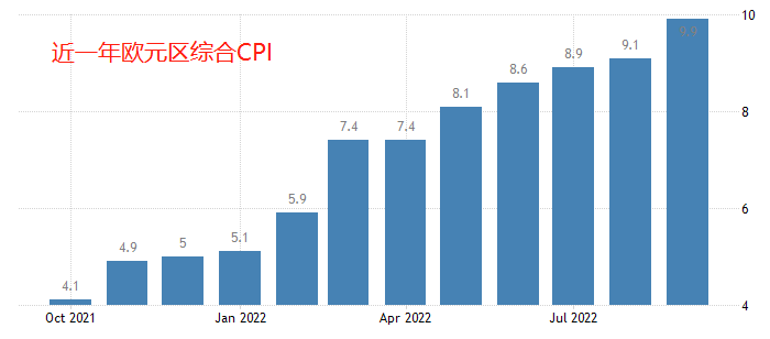 欧元区9月CPI增速9.9%,处于疫情以来最高水平,同时远高于欧央行预期调控目标2%。去年十月份,欧元区CPI增速仅为4.1%,一年时间翻了一倍有余。物价上涨的主要驱动力也就是能源价格(涨幅40.7%),其次是食品和研究,两者分别上涨11.8%和10.6%。即便剔除能源和食品,核心CPI增速在9月份也达到4.8%,同样是年内最高值。